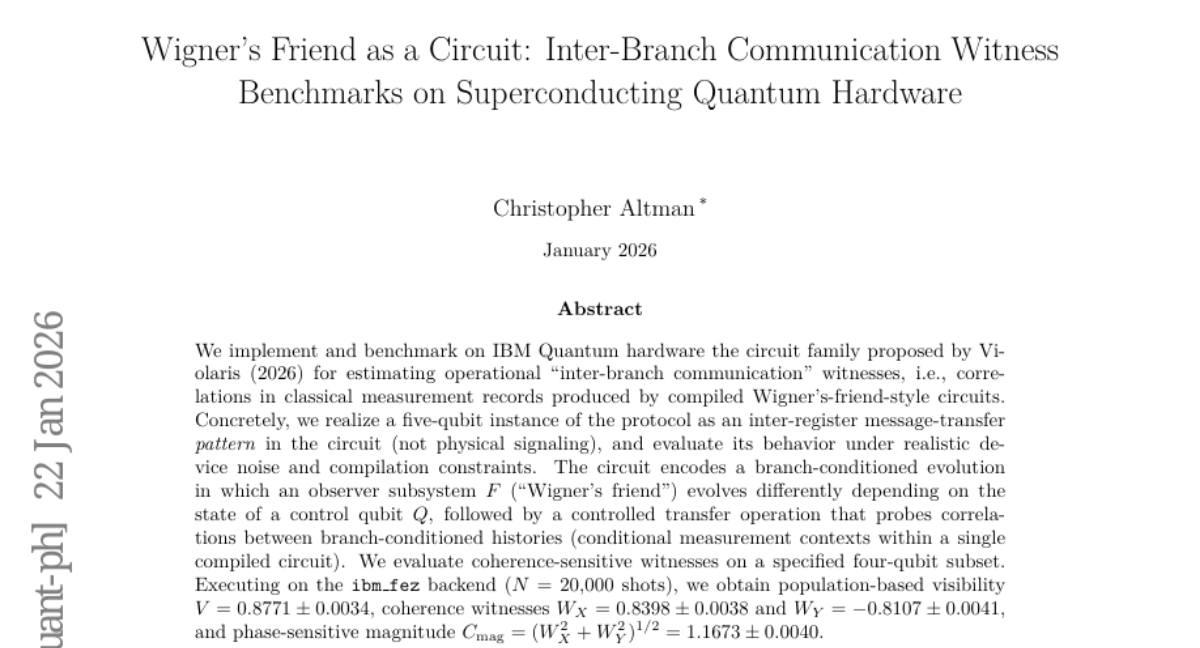 在量子物理的奇幻世界中,有一个著名的思想实验叫做"薛定谔的朋友",它描述的情景就像一个科幻小说里才会出现的场景。这项由Astradyne量子技术与人工智能实验室的研究团队在2026年1月发表的研究论文(论文编号:arXiv:2601.16004v1),首次将这个抽象的思想实验转化为可以在IBM量子计算机上实际运行的具体电路。研究团队在真实的量子硬件上验证了"分支间通信"现象,为我们理解量子世界的神秘性质提供了全新的实验证据。