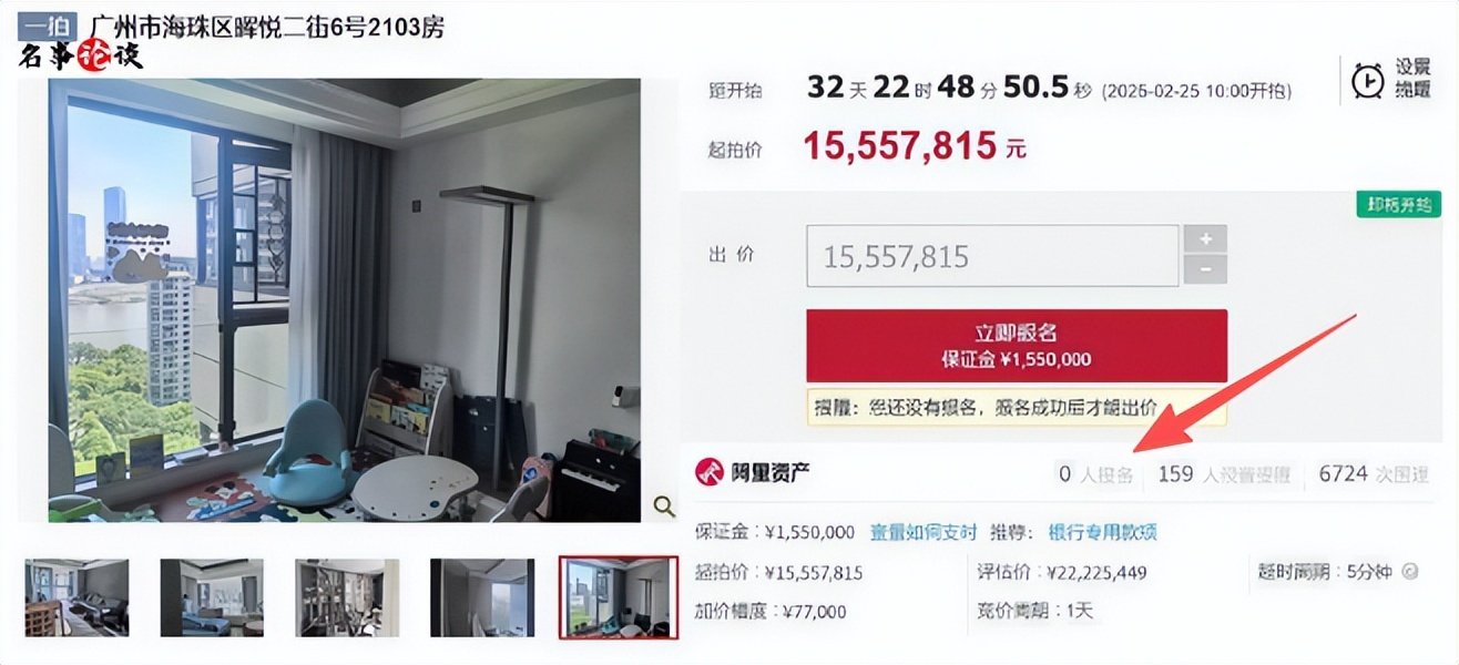 有媒体进行了跟踪回访,1月23日在法拍平台,这套房子已经重新挂拍了。根据平台显示,起拍价还是和上一次一样,为1555.7815万,保证金155万。这次竞拍,将在2026年2月25日展开,不过目前还没有人报名。