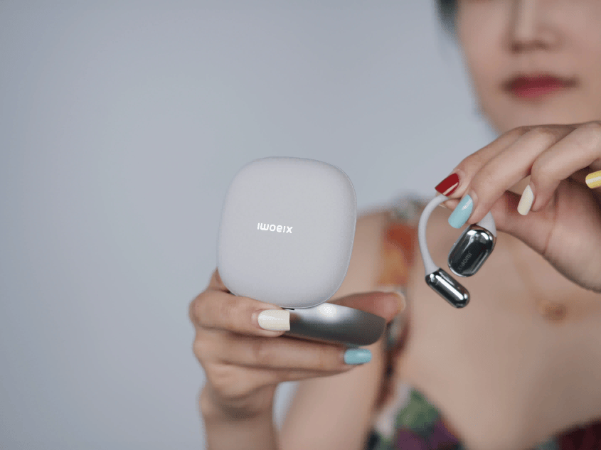 Cleer ARC5以AI智能体验为核心卖点,功能配置颇为全面。耳机采用耳挂式结构,耳挂部分选用医疗级硅胶材质,配合可伸缩、可旋转的双调节转轴,能够根据不同耳型灵活调整佩戴角度,有效提升贴合度与稳定性。单耳重量约11.5克,短时佩戴轻盈舒适。