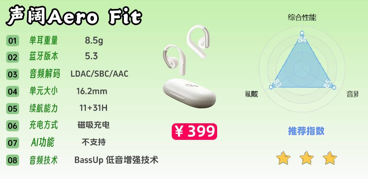 佩戴体验轻巧舒适,适合长时间使用。但由于采用非封闭式设计,运动时贴合度可能因人而异,稳固性存在个体差异。