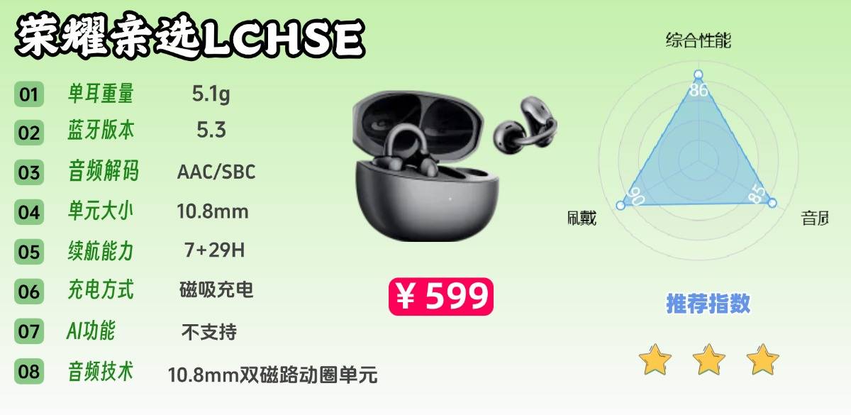 荣耀LCHSE耳机的外观融入中式拱桥意象,以现代手法演绎东方美学,机身选用钛合金与耐磨PC复合材料,兼顾轻盈质感与耐用性。单耳仅重5.1克,佩戴几近无感。