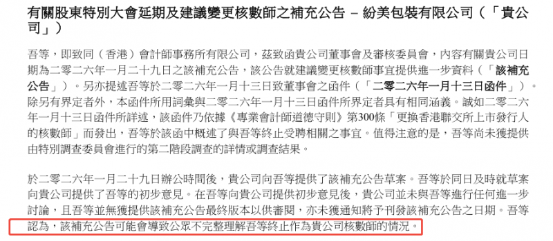 根据纷美包装此前发布的公告内容,公司核数师致同曾明确指出其信披操作中的多项不合规之处:2026年1月29日办公时间结束后,纷美包装才向核数师提供补充公告草案,致同于当日就公告内容反馈了明确审核意见,但公司未就相关意见开展任何正式讨论、未向核数师提供公告最终版本供合规审阅,甚至未提前告知公告刊发日期,便直接对外发布了相关公告。致同明确认为,该行为会导致公众对事件产生不完整理解,严重违背信息披露真实、完整的核心原则。