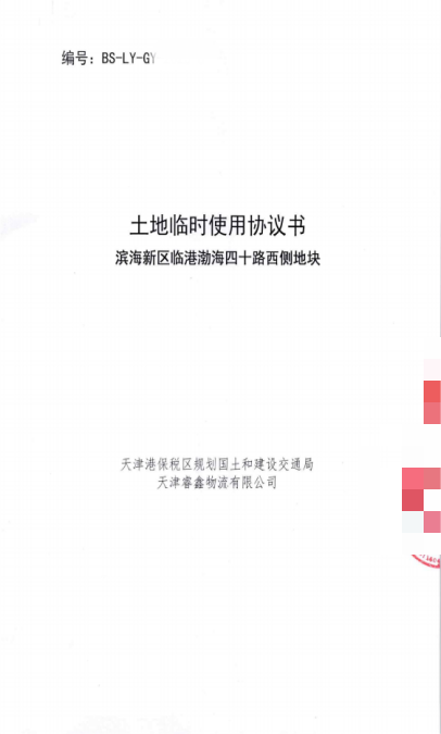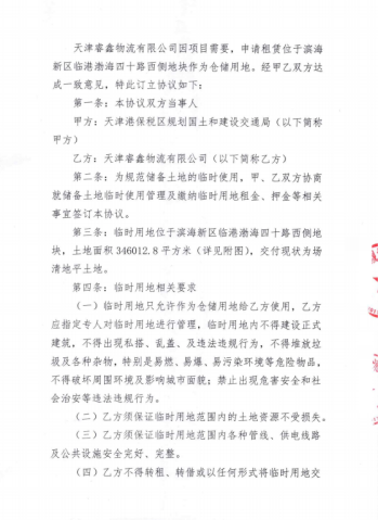 2023年6月9日,睿鑫物流与天津港保税区规划国土和建设交通局签订临时用地协议,租赁滨海新区临港渤海四十路西侧约510亩土地,协议明确使用期限至2025年6月9日届满,到期后10日内需恢复土地原状并交还,同时约定“不得建设正式建筑、不得改变仓储用途”。