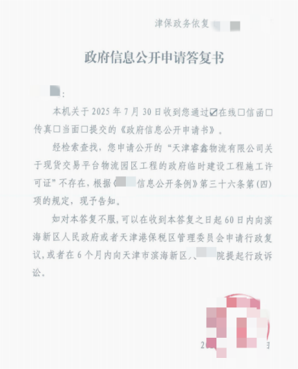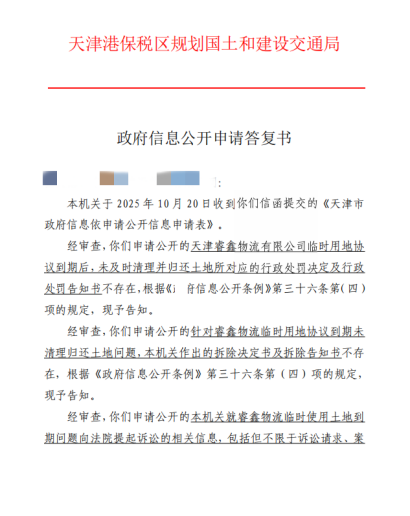 针对睿鑫物流违规建设的核心审批问题,针对睿鑫物流违规建设的核心审批问题,相关监管回应进一步明确了部门职责边界。2026年2月13日,滨海新区规划和自然资源部门针对天津自由贸易试验区人民法院的律师调查令作出复函,对睿鑫物流现货交易平台物流园项目的审批情况进行查询后给出明确结果:未查到该项目的建设用地规划许可、建设工程规划许可,同时表示建设工程施工许可、项目竣工验收备案均非其职能范围,建议向建设主管部门查询。