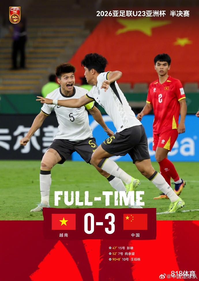 中国队进球都在下半场,第47分钟,21号鲍盛鑫主罚角球开出,15号彭啸门前甩头攻门入网,u23国足1-0越南!比赛第57分钟,7号向余望转身左脚抽射破门,U23国足2-0领先!第90+9分钟,9号拜合拉木左路冷静横传,10号王钰栋跟进推射得手,随后脱衣庆祝染黄,u23国足3-0越南!