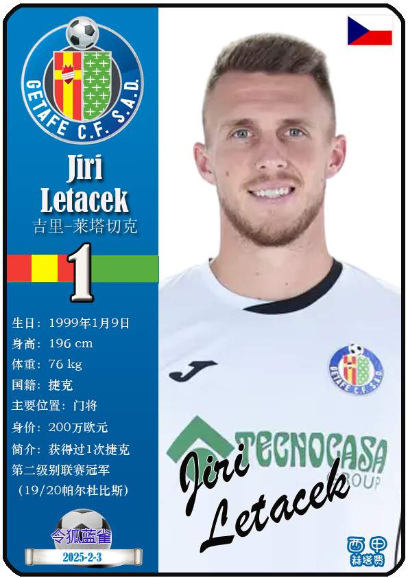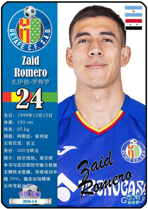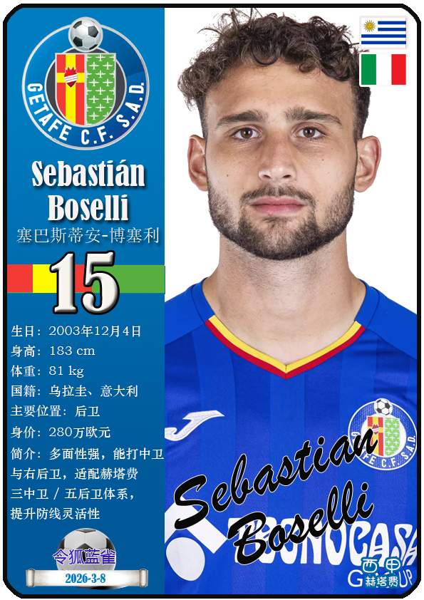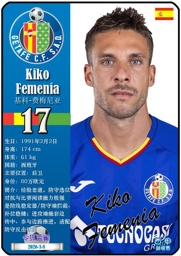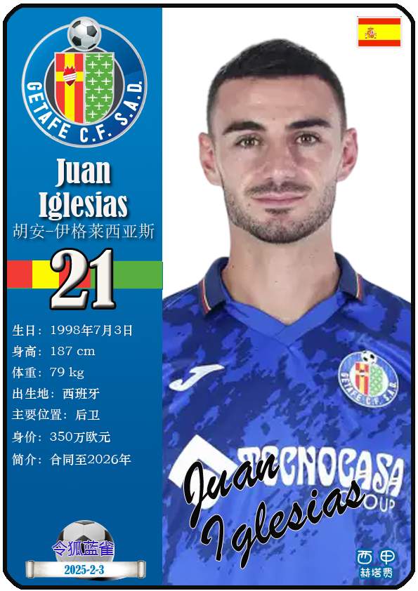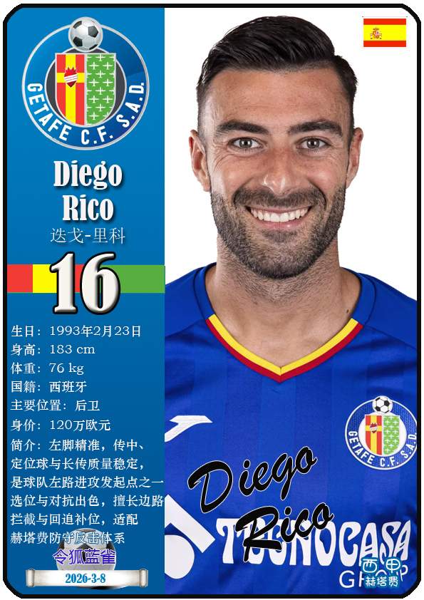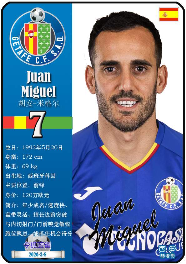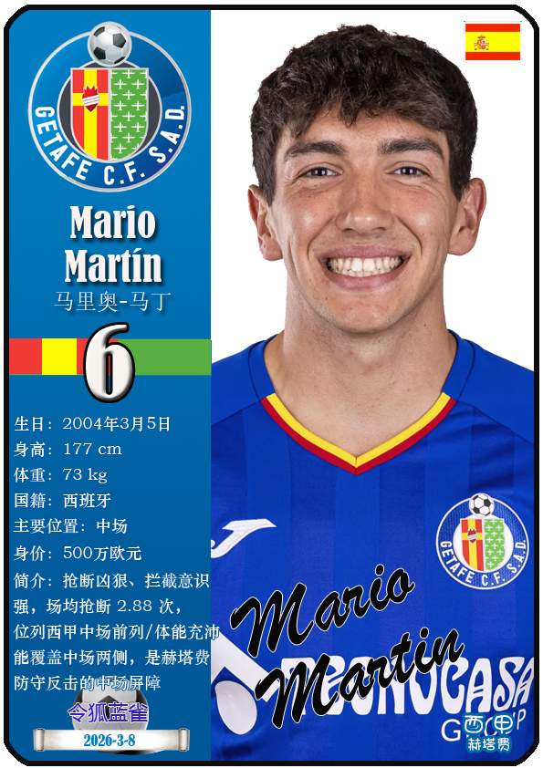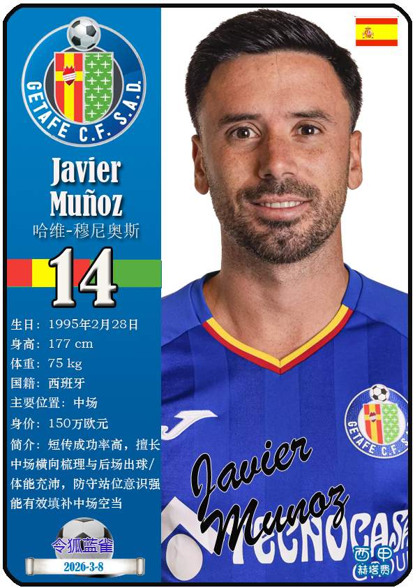 西甲赫塔费足球俱乐部成立于1946年,距今已有80年历史。目前球队主教练是佩佩·博尔达拉斯,队内拥有球员马丁-萨特里亚诺、博尔哈-马约拉尔、胡安-米格尔等。本期以球星卡的形式展示截至2026年3月9日,西甲赫塔费足球俱乐部的24名球员(按球衣号码排序):