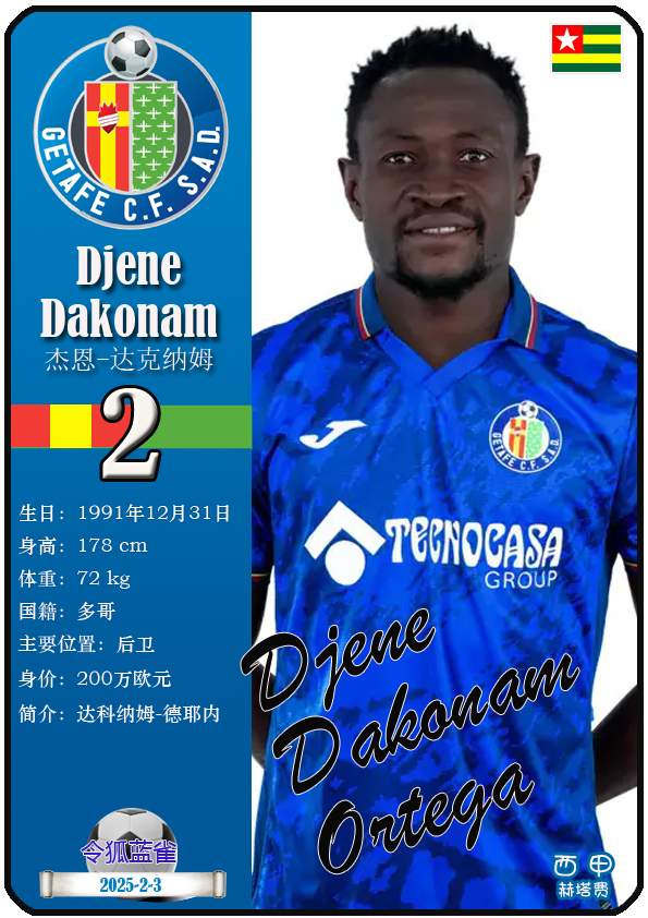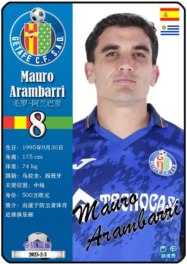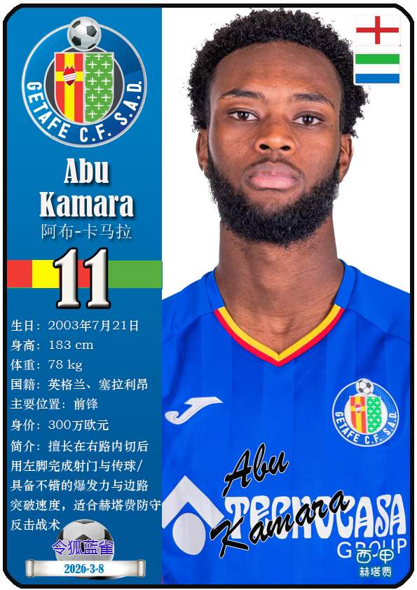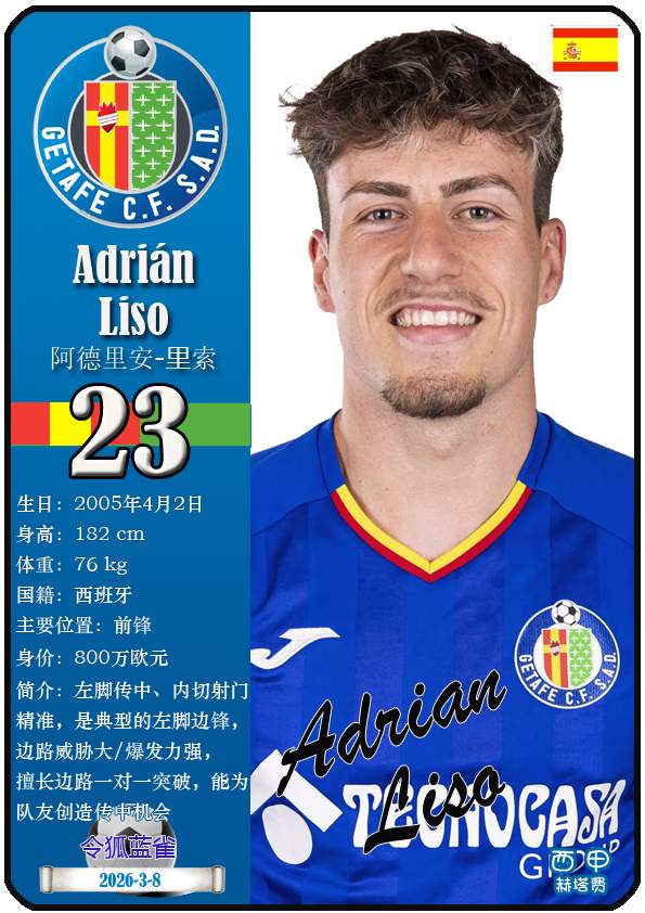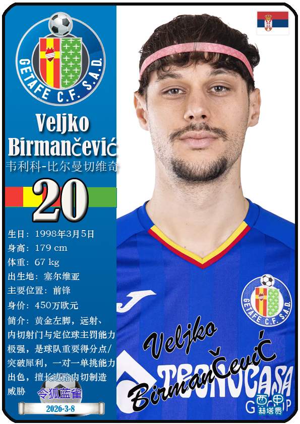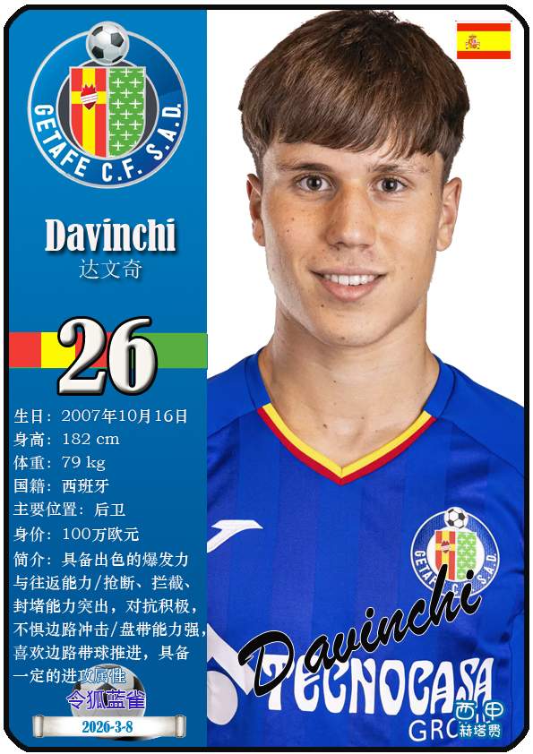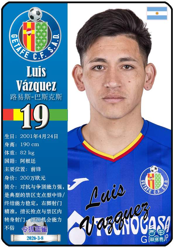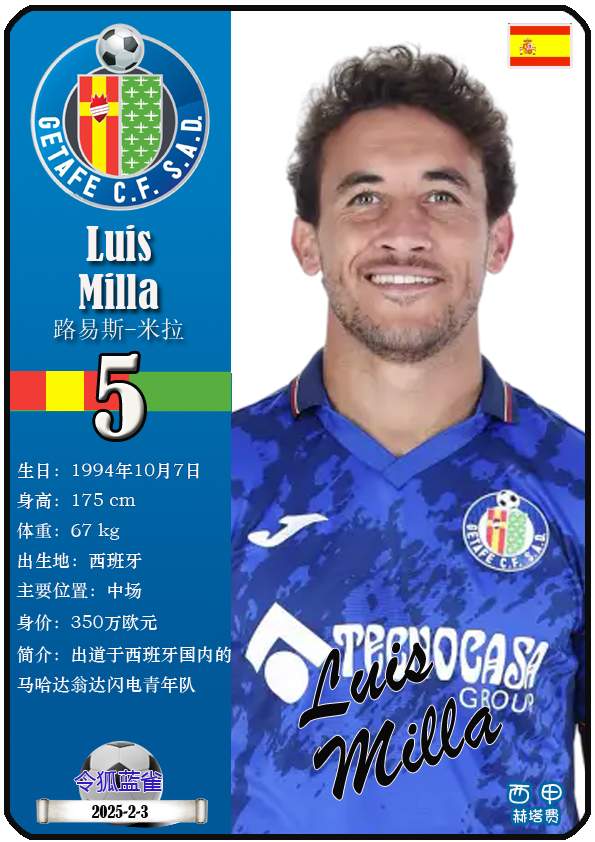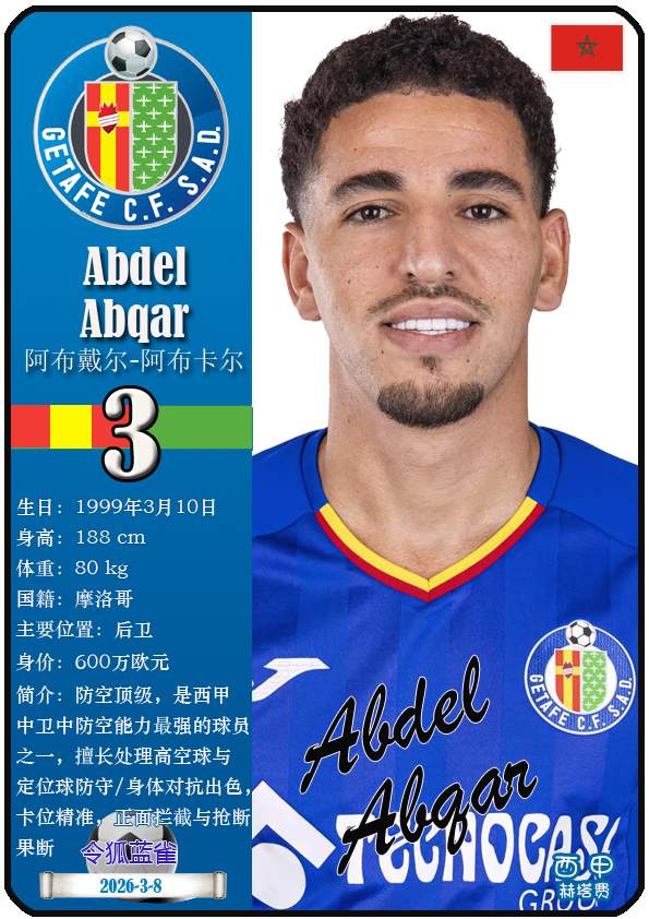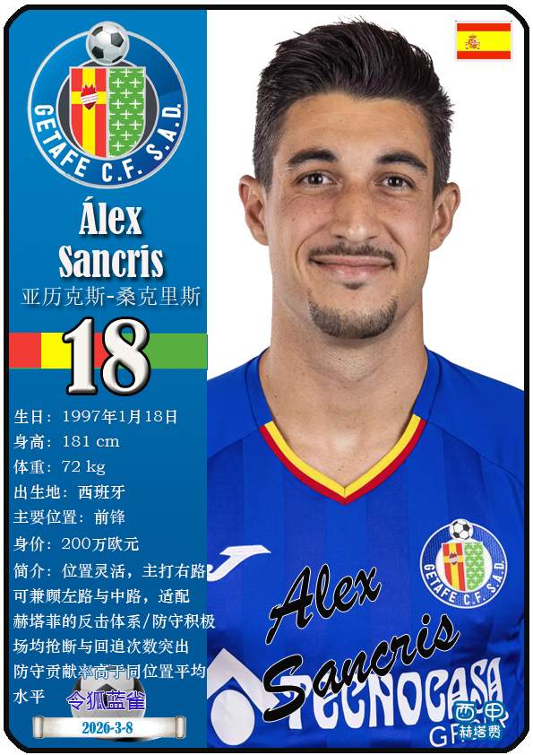 西甲赫塔费足球俱乐部成立于1946年,距今已有80年历史。目前球队主教练是佩佩·博尔达拉斯,队内拥有球员马丁-萨特里亚诺、博尔哈-马约拉尔、胡安-米格尔等。本期以球星卡的形式展示截至2026年3月9日,西甲赫塔费足球俱乐部的24名球员(按球衣号码排序):