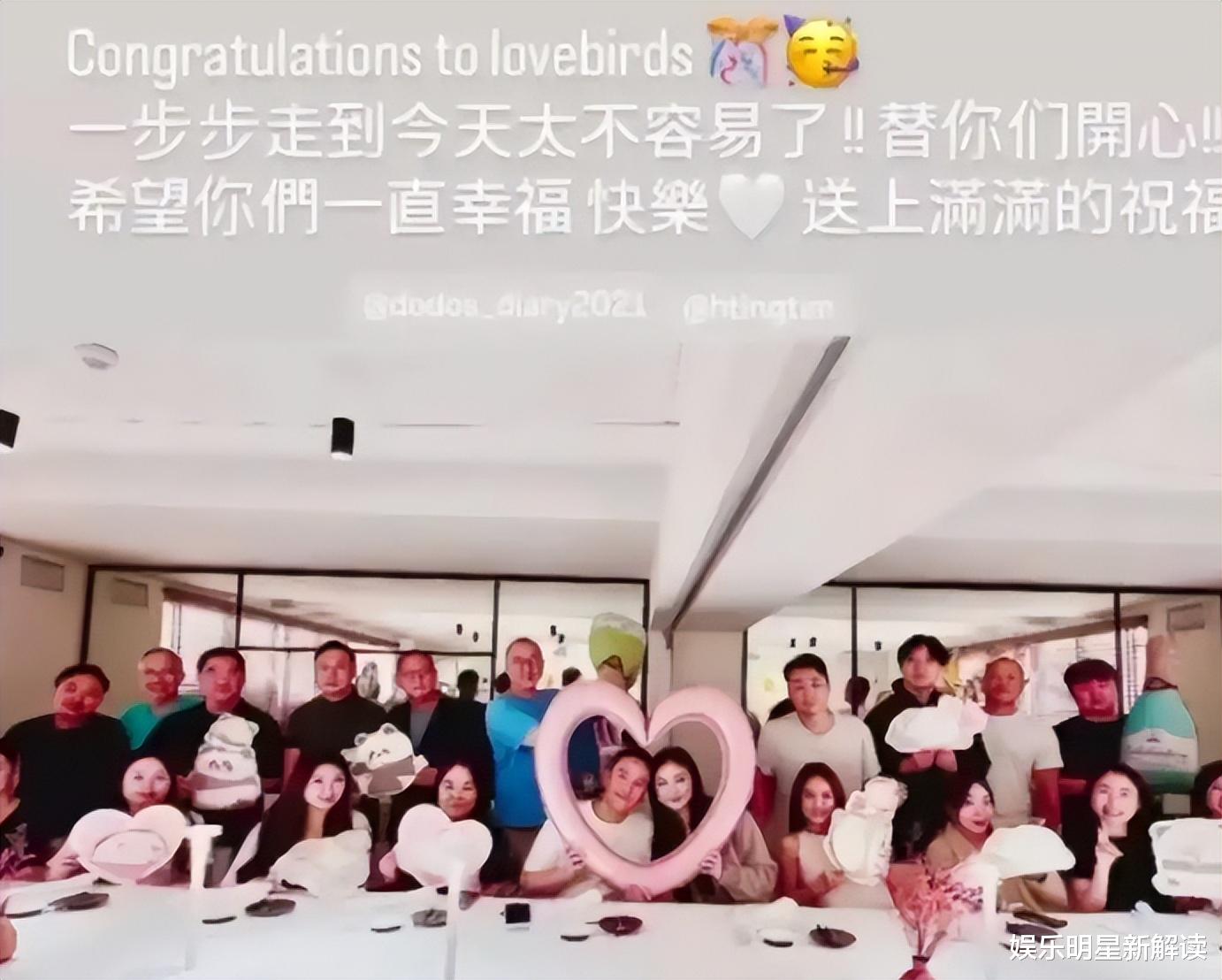 通过照片我们看到参加聚会的人不少,应该是男女双方的好朋友,从后面的装修风格看可能是在一个大别墅中进行。这次聚会的主题应该就是公开两人的恋情关系,只见何猷启与女友坐在C位,还一同举着粉色的爱心框,头靠在一起,大方秀恩爱,应该是交往好久终于离修成正果不远了,而亲朋好友则是拿着象征爱情的装饰品与他们一起合照。