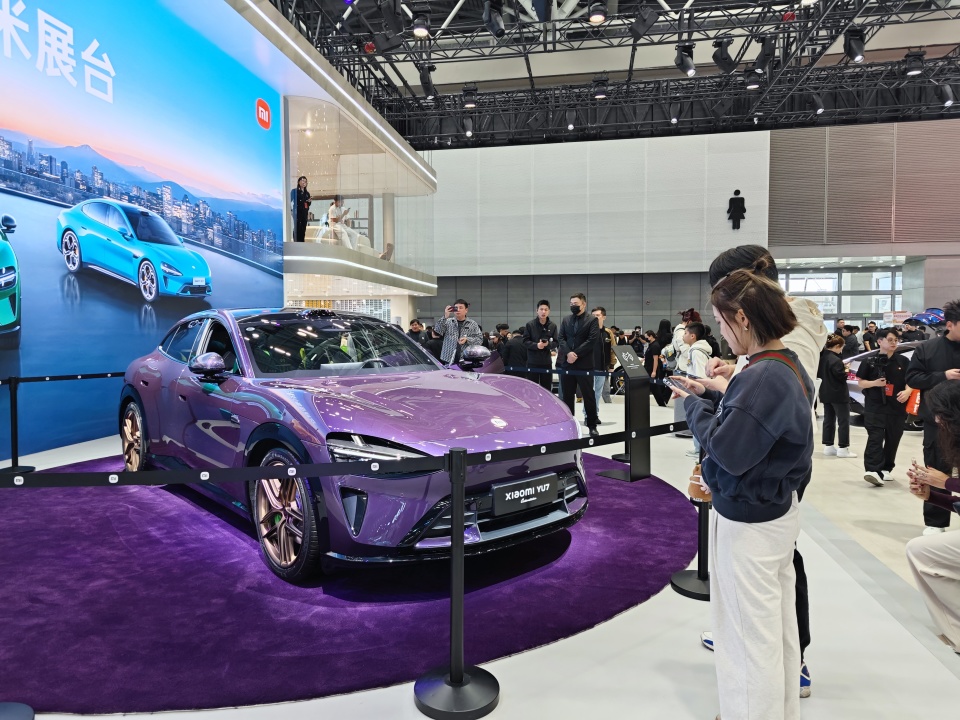 小米展台今年依旧带来了 SU7、SU7 Ultra 和 YU7,但观众的新鲜感明显不如以往,排队拍照的人少了,人流也平缓不少。