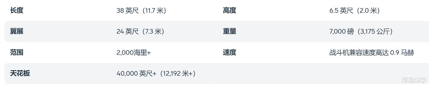MQ-28的设计融合了“功能灵活”与“生存优先”两大理念。其机身长11.7米(约38英尺),翼展7.3米(约24英尺),最大航程超3700公里(2000海里+),飞行速度达0.9马赫,升限超12000米(40000英尺+),具备与战斗机相当的飞行性能。值得关注的是其隐身气动布局:无水平尾翼设计搭配机尾“V”型尾翼,显著降低雷达反射面积;机身前部配备2.6米长的模块化鼻锥(内部容积0.15立方米),可快速更换侦察、预警或电子战设备,实现“一机多能”。