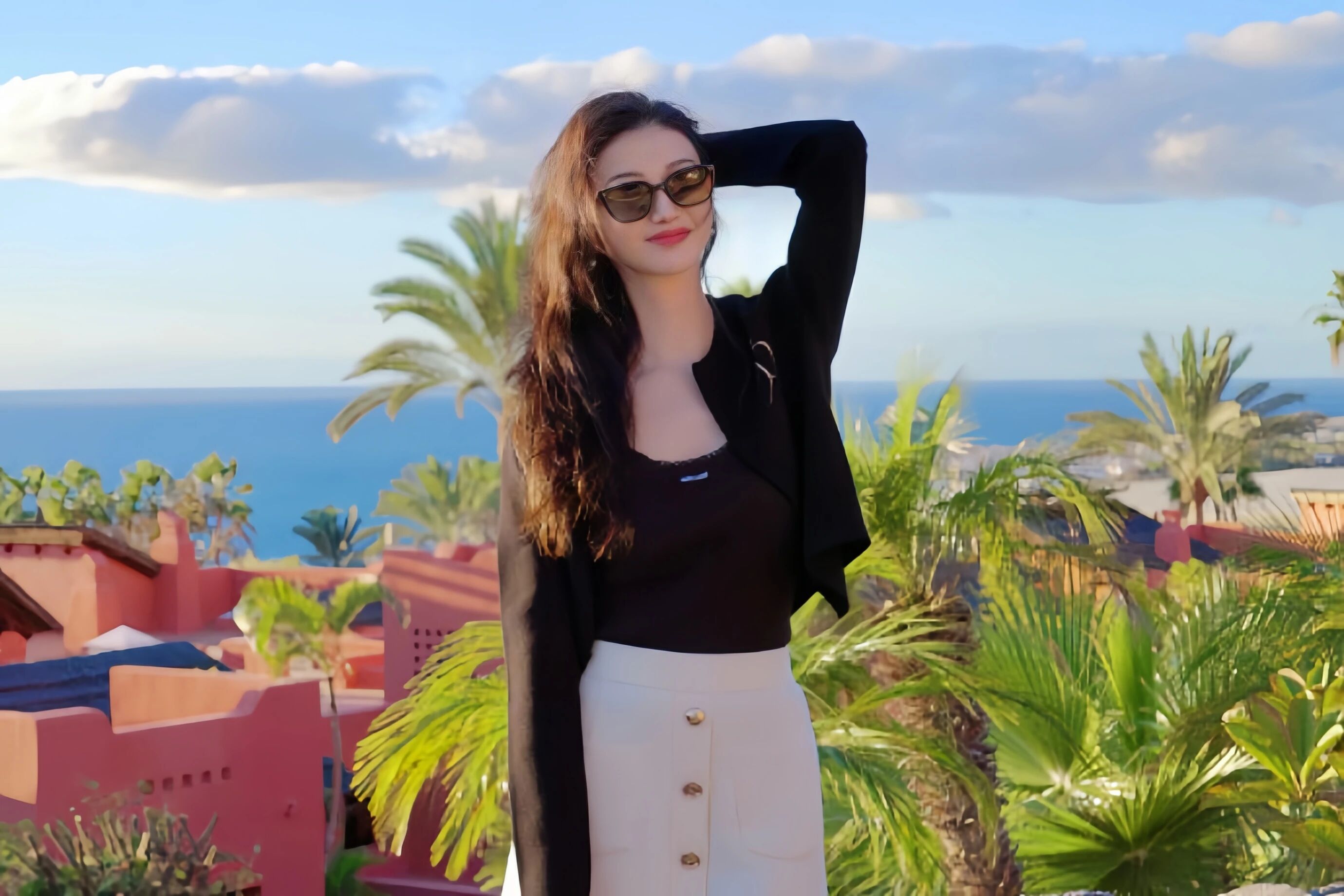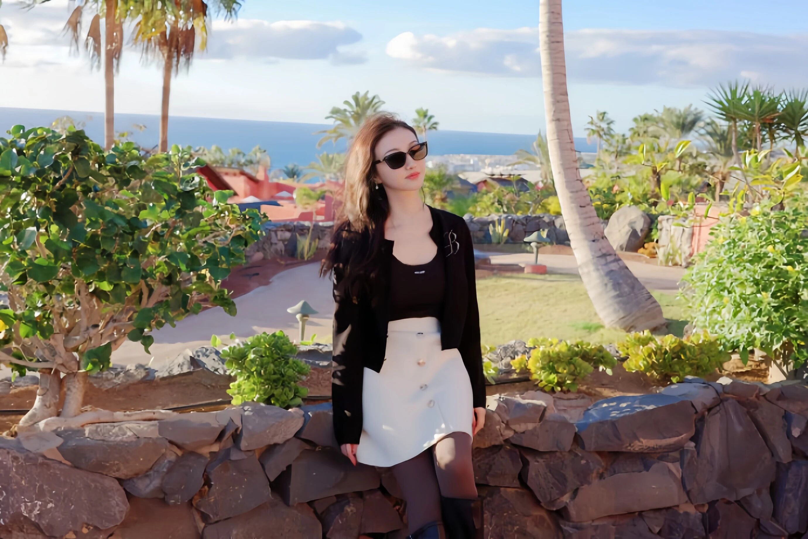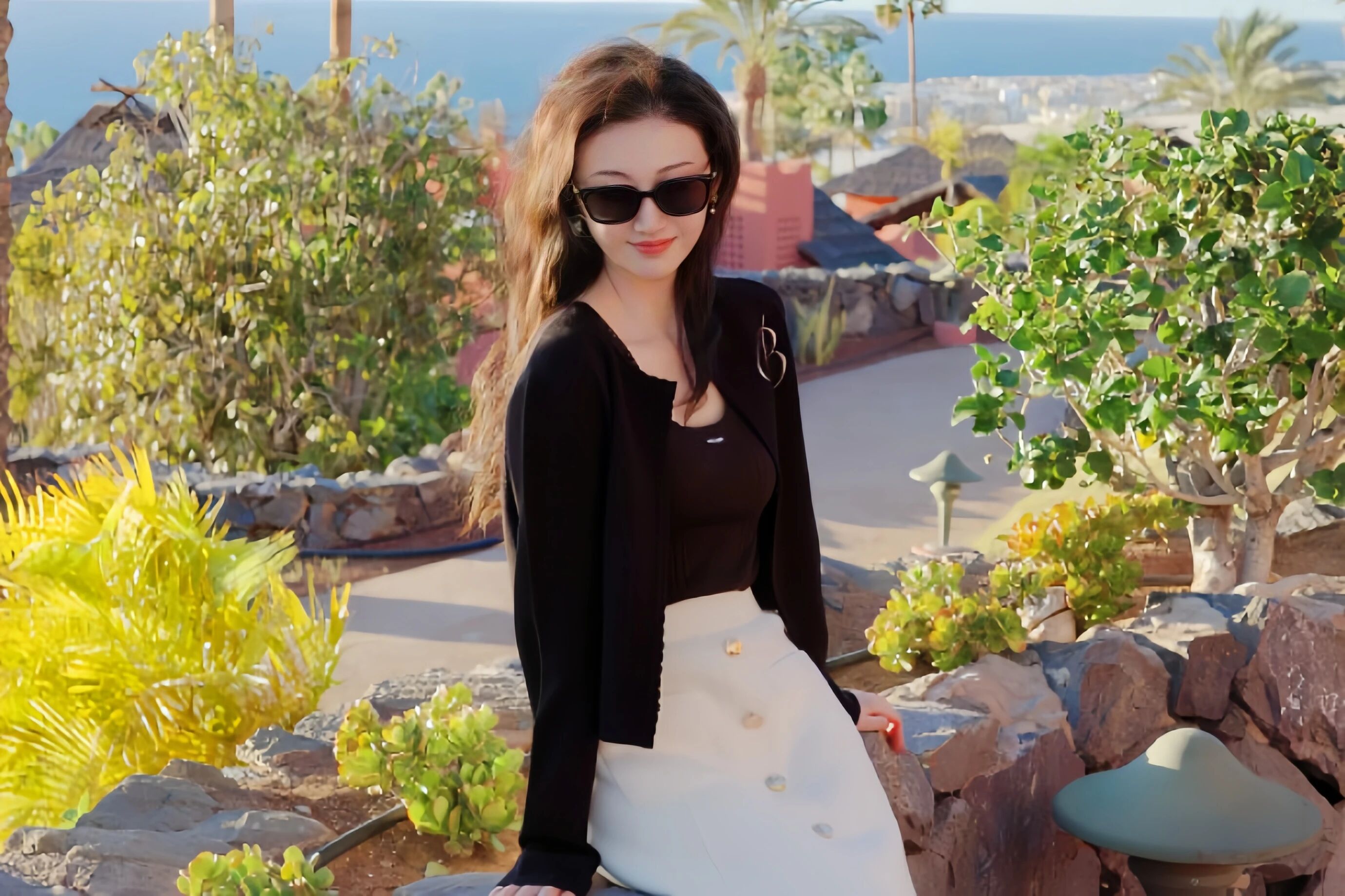 这组照片最打动人的,是那种 “没准备好被拍” 的松弛感。她没穿华丽的度假裙,只是一件简单的黑色开衫搭同色系内搭,再配一条米白色半裙,像每个周末出门散步的姑娘。可偏偏就是这样的随意,让她和身后的碧海蓝天、红瓦石墙融成了一幅画。原来高级的氛围感,从来都不需要堆砌昂贵的单品。