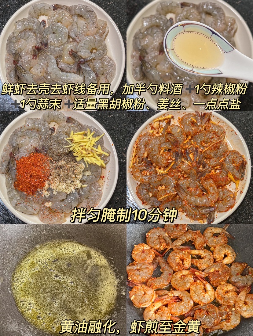 做这道菜,第一步是处理虾仁。根据图片里的方法,选择新鲜的虾(或者冷冻虾仁解冻后使用),去掉虾壳和虾线(这是腥味的主要来源,一定要处理干净),然后用厨房纸巾吸干水分(这样煎的时候才能快速定型,不出水)。处理好的虾仁放入碗中,加入半勺料酒(去腥增香)、1勺辣椒粉(根据个人口味调整,喜欢微辣的可以放,不放也好吃)、1勺蒜末(提前剁碎,用量可以根据喜好增减)、适量黑胡椒粉(提香去腥)、姜丝(增香,不喜欢姜的可以少放)、一点点盐(入味,盐量要轻,因为后续炒制时还会调味),用手抓拌均匀,腌制10分钟。这一步是虾仁入味的关键,料酒和黑胡椒能有效去腥,蒜末和辣椒粉则让虾仁提前裹上风味,煎出来更香。腌制的时间不用太长,10分钟足够,这样虾仁既入味又不会变老。
