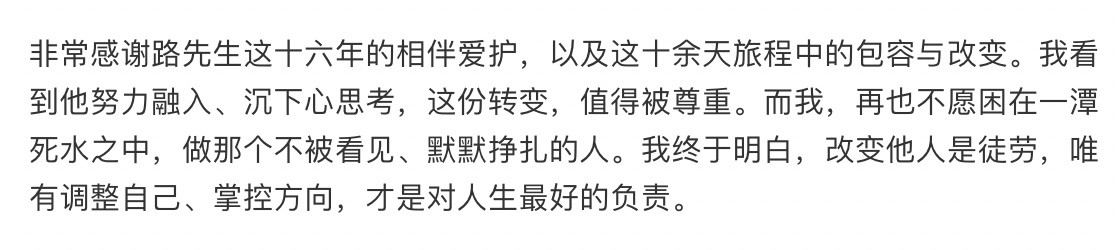 对于这段婚姻的终结,邓莎没有过多指责,反而感谢路行十六年的相伴与爱护,但也明确表示再也不愿困在一潭死水的婚姻里。