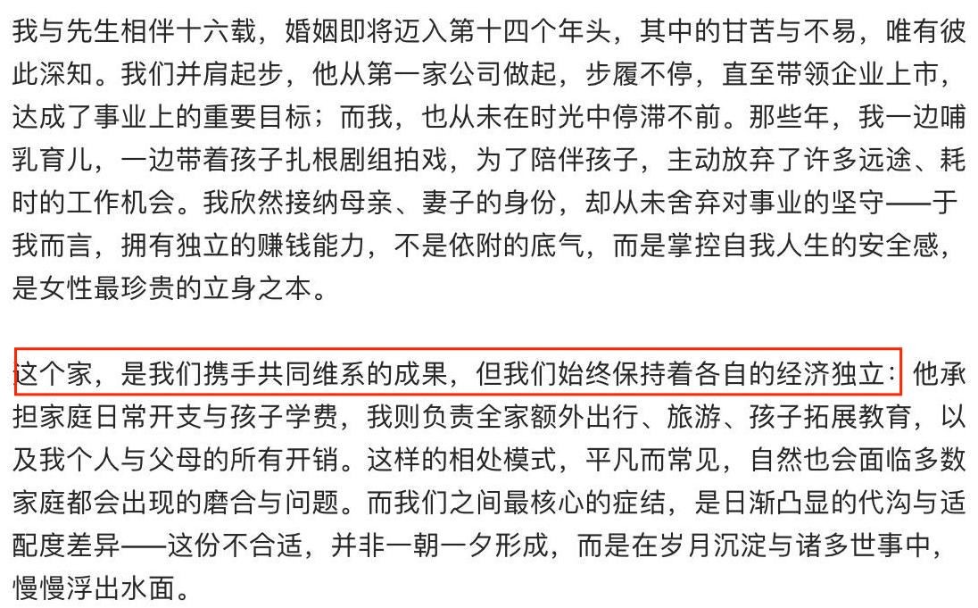 直到节目收官,她才用一篇千字长文,回应了所有争议,也官宣了离婚的决定。