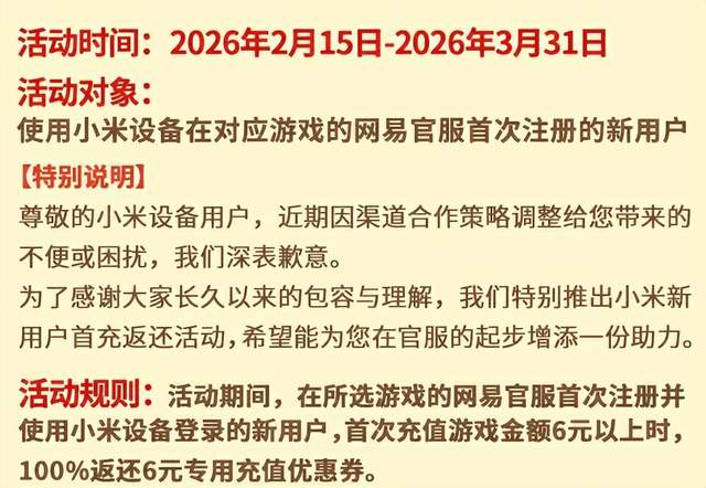 第二重是小米用户专属首充返券,因为渠道合作策略调整,网易特意给小米设备用户准备了致歉福利,小米/Redmi/POCO品牌的手机和平板用户,在官服首次注册登录并完成 6 元以上首充,就能 100% 返还 6 元专用充值券,相当于首充白嫖,小米玩家这波专属福利直接拉满。