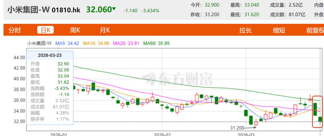 小米股价3月20日和3月23日股价遭遇连跌,分别下跌8.59%和3.43%。进入2026年至今(3月23日收盘的32.06港元),小米股价跌幅达19%。最新市值为8314亿港元,相比2025年6月27日1.55万亿港元的市值高点,已经蒸发了约7200亿港元。可以说新一代小米SU7还承担着提振股价的重任。