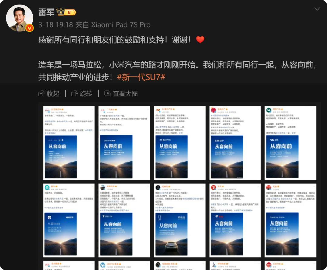 一场价值连城的“朋友圈”营销小米汽车SU7的发布,无疑是中国新能源汽车市场的一枚重磅炸弹。然而,在这场产品大秀之外,雷军通过一条微博晒出的15家车企及供应链巨头的祝福海报,以及发布会现场星光熠熠的合影,构成了另一场更为深远的行业事件。从比亚迪、蔚来到奔驰、理想,再到京东、阿里,这张几乎涵盖中国汽车与科技圈顶级力量的“全家福”,不仅彰显了雷军深厚的行业人脉,更在客观上为小米汽车节省了巨额的营销费用,完成了一次高维度的品牌背书。