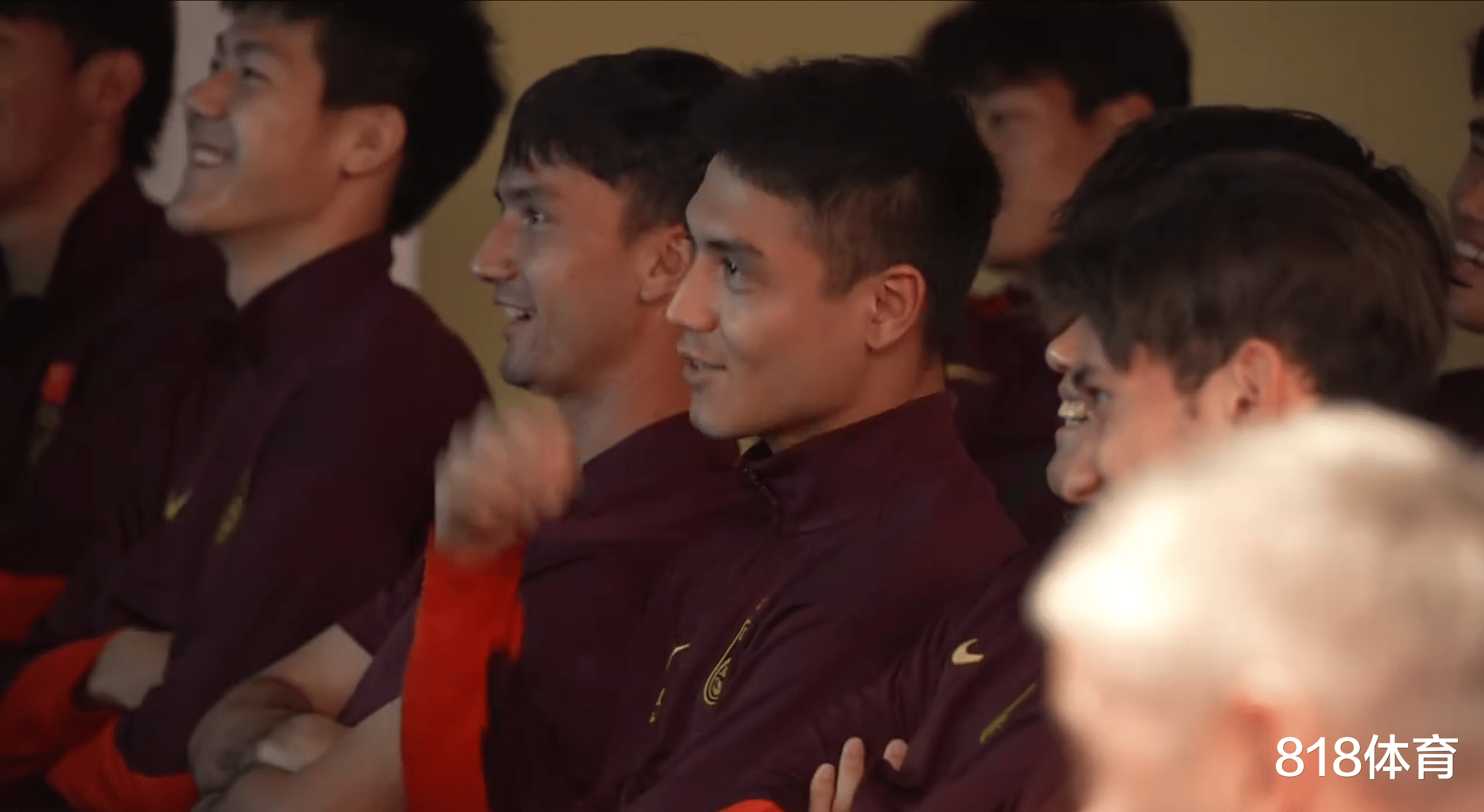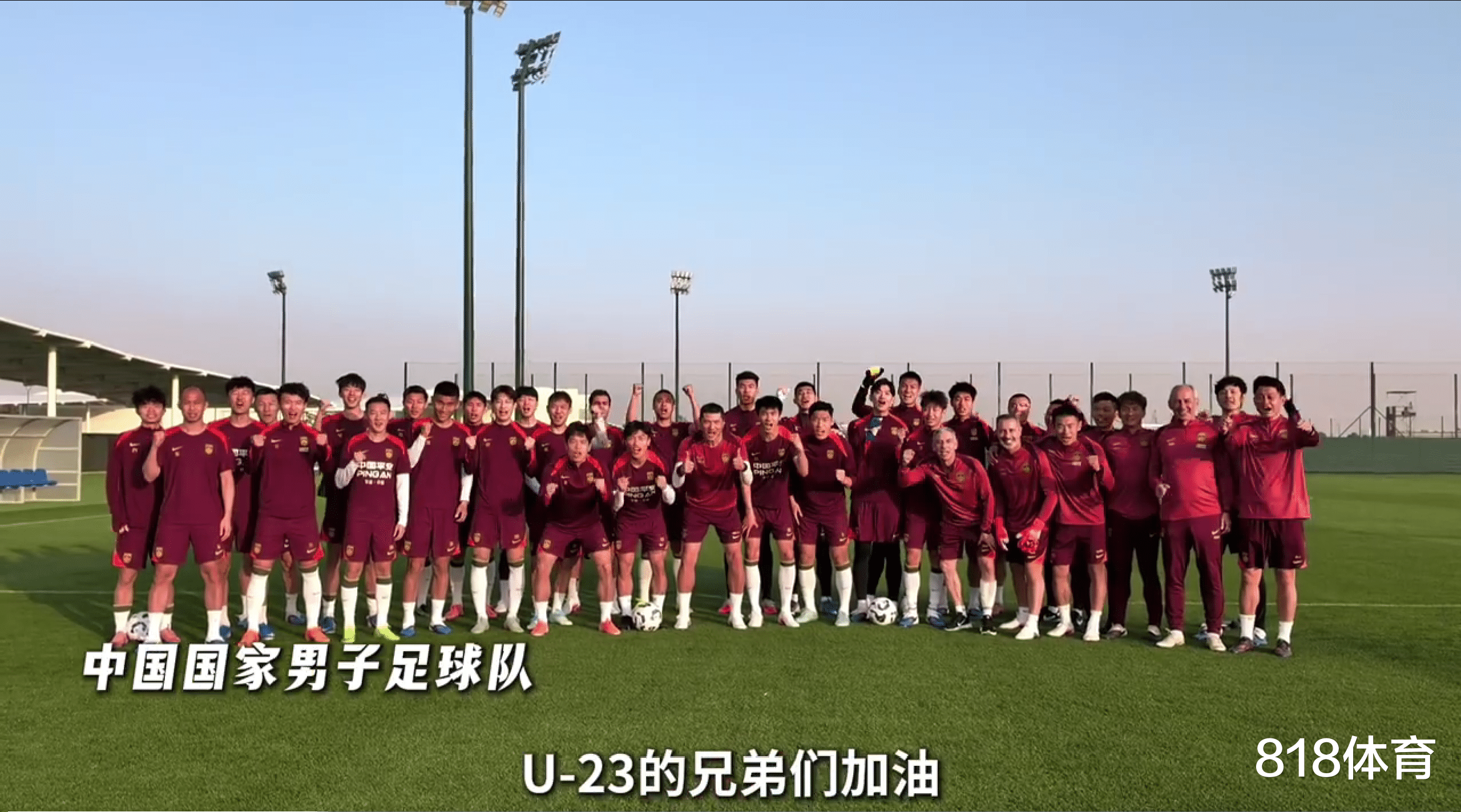 正在集训的国足全体队员们一起高喊,“U23的兄弟们,加油!”