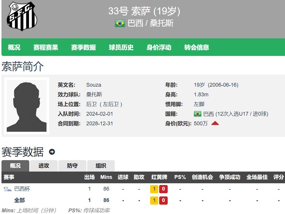 现年19岁的索萨,身高1.83米,左脚球员,主打左后卫位置,去年1月完成桑托斯首秀,去年5月迎来巴甲首秀,上赛季巴甲出场24次,其中19次首发,合计出场1641分钟,贡献1球2助。索萨还是巴西U17国脚,出场12次,并随队参加了U17世界杯,出场5次,助球队晋级8强!