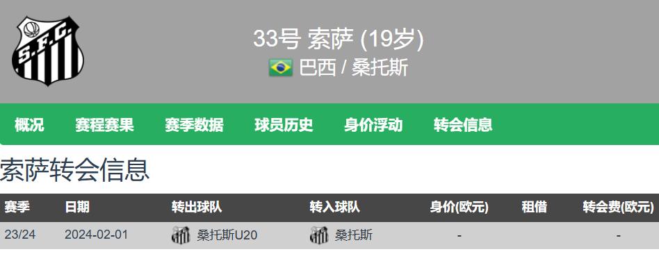 来自英超Big6球队热刺的官方消息,俱乐部与桑托斯就巴西19岁边后卫索萨签下了一份长期合同。据之前罗马诺称,热刺签下索萨的转会费为1500万欧元,而球员在德转的身价为500万欧元。