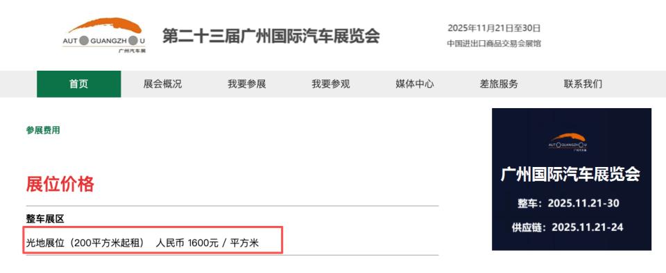 电车通查过广州车展的官方报价,整车展区的光地展位费用已达 1600 元/平方米,但这,这只是烧钱的开始。