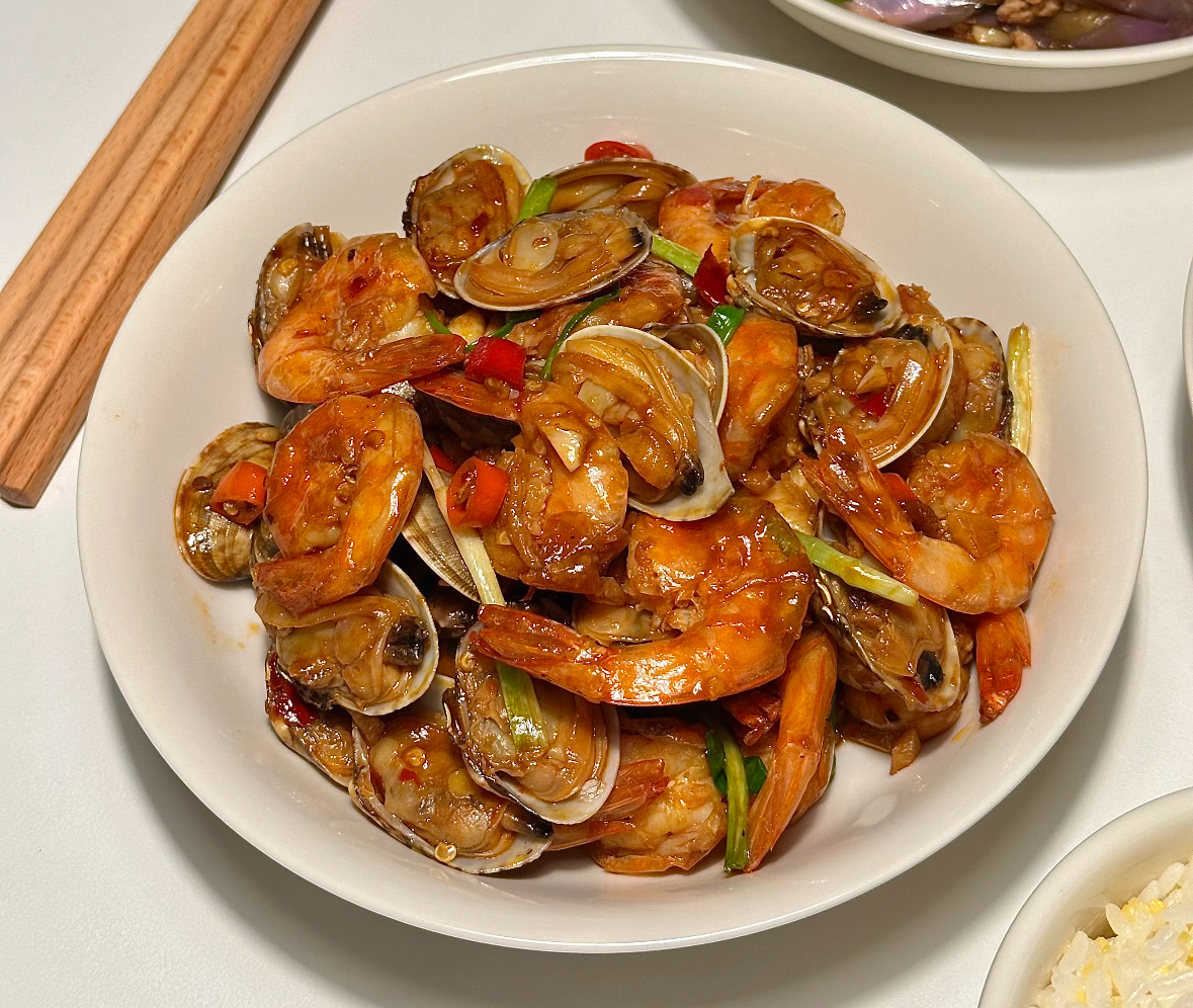 大虾要开背,去虾线,这样更入味。油热了,下虾,两面煎到金黄,虾壳酥脆,虾肉紧实,盛出来备用。这时候锅底还有虾油,别洗,直接下姜末蒜蓉小米辣,炒出香味,再加一勺豆瓣酱,小火炒出红油。然后倒进花甲和虾,大火翻炒,让每一只都裹上酱色。蚝油提鲜,生抽入味,老抽上色,一点点盐和鸡精,最后扔一把葱段,翻两下,出锅。
