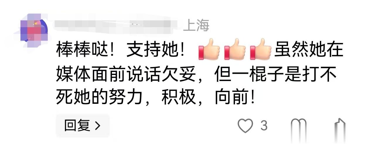 有网友留言,棒棒哒!支持她,虽然她在媒体面前说话欠妥,但一棍子是打不死她的努力、积极、向前。