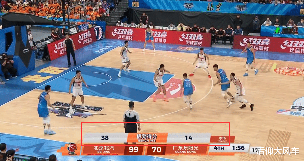 这一场比赛北京首钢赢得有点狠了,出乎不少球迷预料,赛前很多球迷预测,北京这场少了陈盈骏,替补阵容没人带可能会很难打,赵睿还会像上一轮打广厦那样打得很累,但没想到昨晚北京不仅首发打得好,替补也更是完胜广东,第四节还剩2分钟阶段,当时北京已经取得99-70领先,此时导播在屏幕下方打出了广东和北京两队板凳得分对比,北京38-14遥遥领先广东,说明这一场北京首发和替补都同样出色。