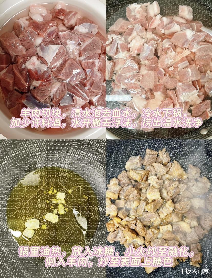 炒糖色是这道菜的灵魂步骤,能让成品色泽红亮、味道更丰富。锅中倒少许油,放入几颗冰糖,用小火慢慢炒至冰糖融化并变成琥珀色,此时迅速倒入沥干水分的羊肉,快速翻炒,让每块肉都均匀裹上糖色。这一步要注意火候,火太大容易炒糊,会有苦味;火太小则糖色不出,影响成菜效果。