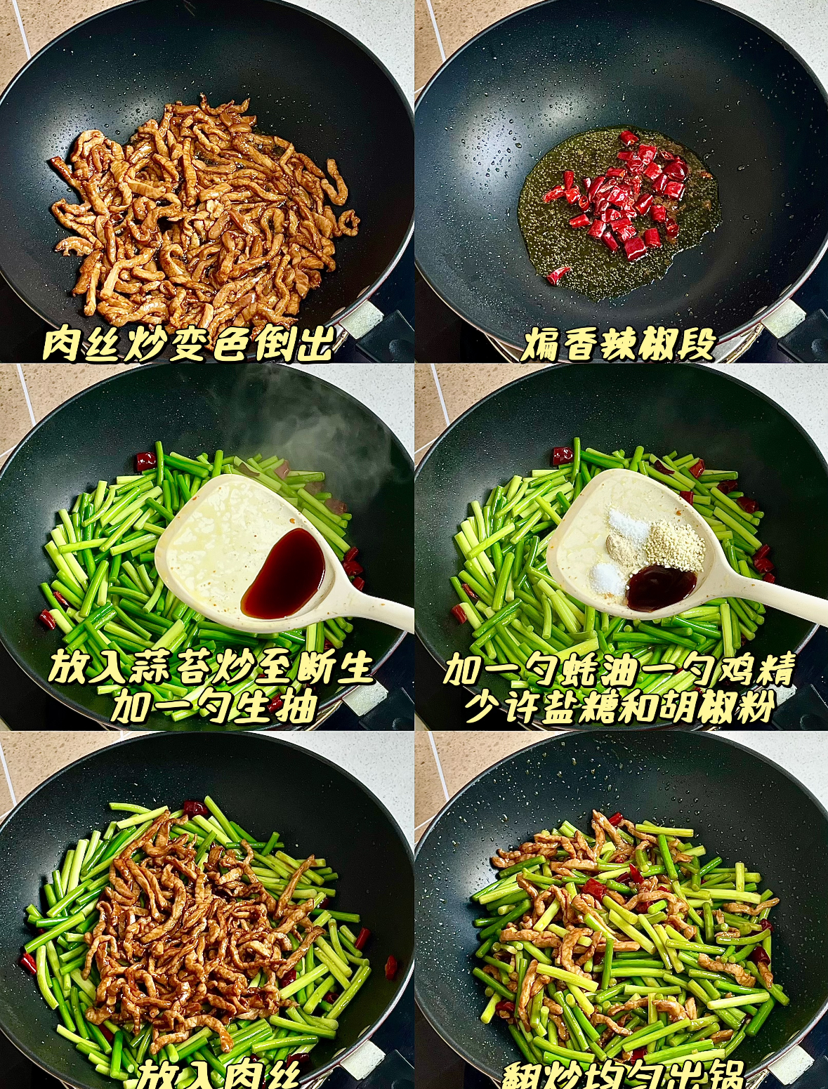 蒜苔断生了,把之前炒好的肉丝倒回去,和蒜苔一起翻炒均匀。肉丝重新回锅,带着之前腌制的底味,和蒜苔的清香融在一起。这时候开始调味:一勺蚝油提鲜,一勺生抽增香,一勺鸡精让味道更丰富。盐要少放一点,因为生抽和蚝油已经有咸味。再来一点点白糖提鲜,一点点胡椒粉去腥增香。所有调料下锅之后,快速翻炒,让每根蒜苔、每根肉丝都均匀裹上酱色。