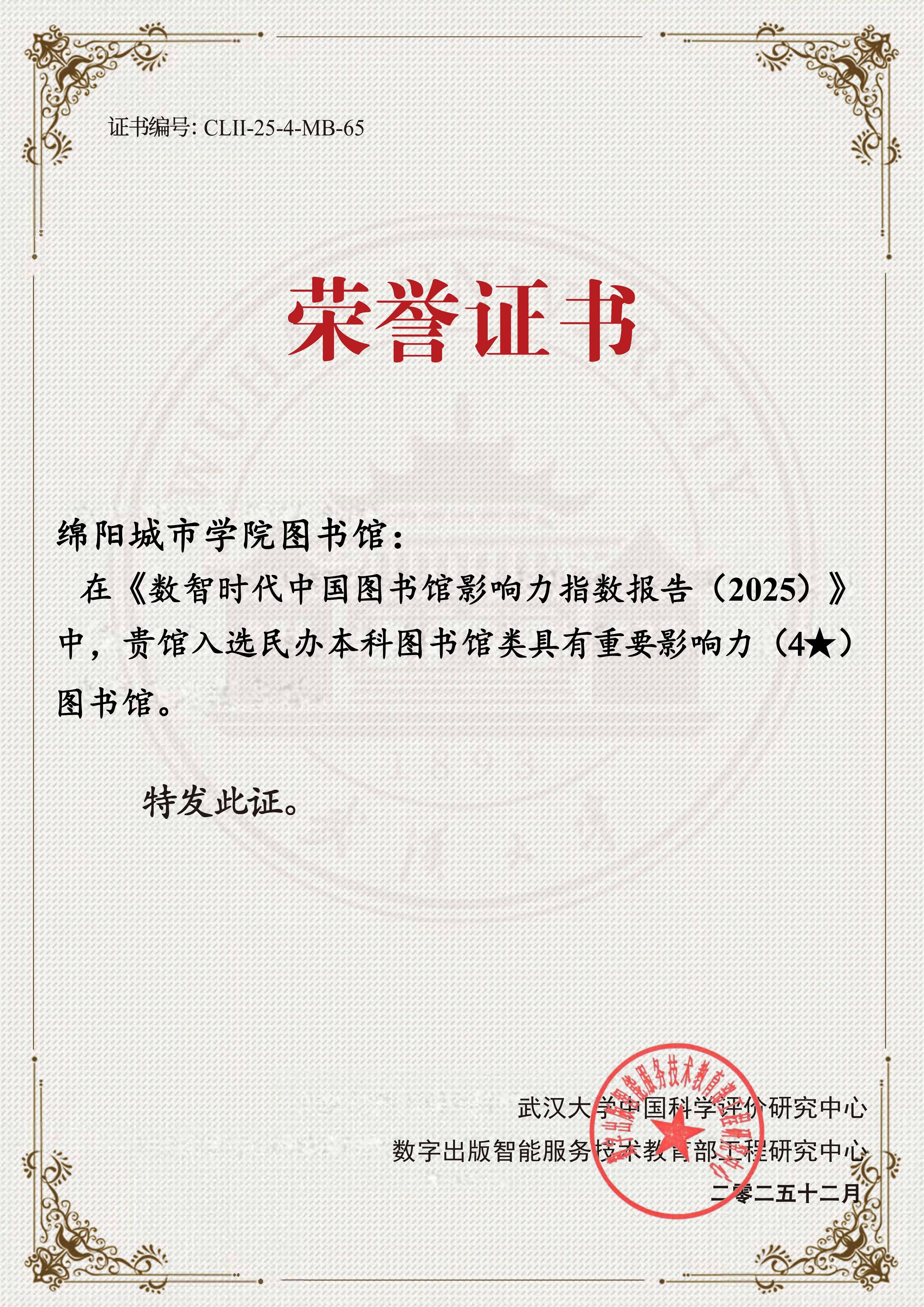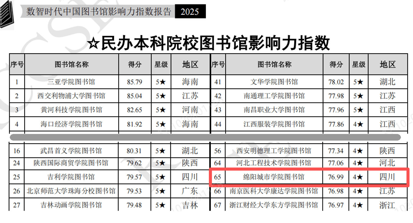近日,武汉大学中国科学评价研究中心、数字出版智能服务技术教育部工程研究中心联合发布了《数智时代中国图书馆影响力指数报告(2025版)》(以下简称“报告”)。报告对全国高校图书馆、公共图书馆及专业图书馆共5289家图书馆进行了分类综合影响力评估。在此次评价中,绵阳城市学院图书馆在民办本科院校图书馆类别中表现突出,获评四星级单位,影响力指数在全国参评的430所同类图书馆中位列第65名,排名进入前15%,跻身“具有相对重要影响力”的图书馆行列,体现了本校图书馆在资源建设、数字化服务、学术支持、新媒体宣传及社会认可等方面的综合实力。