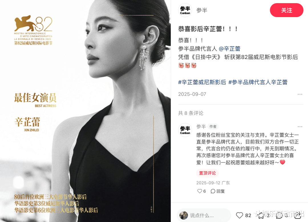 辛芷蕾粉丝多为25-45岁轻熟女、职场人群也是品质消费者,与华晨宇Z世代粉丝形成了消费心智上的互补,也让参半逐渐覆盖到全年龄段家庭用户,为其线下渠道和长期用户复购奠定基础。同时,辛芷蕾身上“高级脸、实力派、国际影后”等标签,能够快速提升参半的品牌精致度和专业感,推动参半向中高端口腔护理定位靠拢。