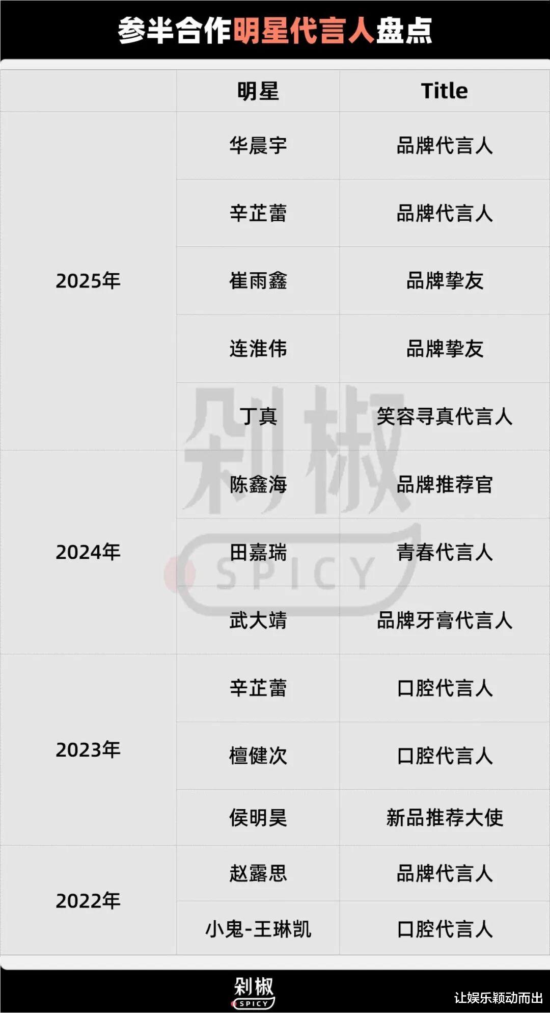 据剁椒Spicy盘点,自2022年起至今,与参半达成代言合作的明星多达12个,其中绝大多数为品牌推荐官,真正的代言人仅有赵露思、辛芷蕾和华晨宇三人。