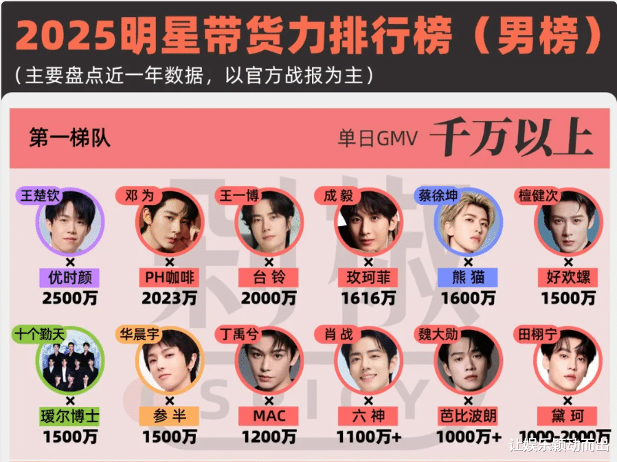 据剁椒Spicy 明星带货力榜单显示,华晨宇官宣代言参半后,单日 GMV 高达1500 万元,一举跻身 2025 年内娱男星带货第一梯队,与养成系组合十个勤天并列,表现甚至超越肖战、田栩宁等顶流艺人。