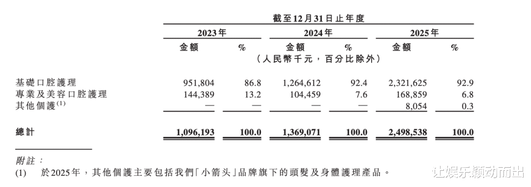 华晨宇的到来,成为关键的业绩变量。招股书显示,2025年,小阔科技营收同比激增82.5%,新增的11.3亿元营收中,基础口腔护理(牙膏、牙刷)贡献了10.57亿元,成为业绩核心增长支柱,这一爆发节点与官宣华晨宇代言高度重合。