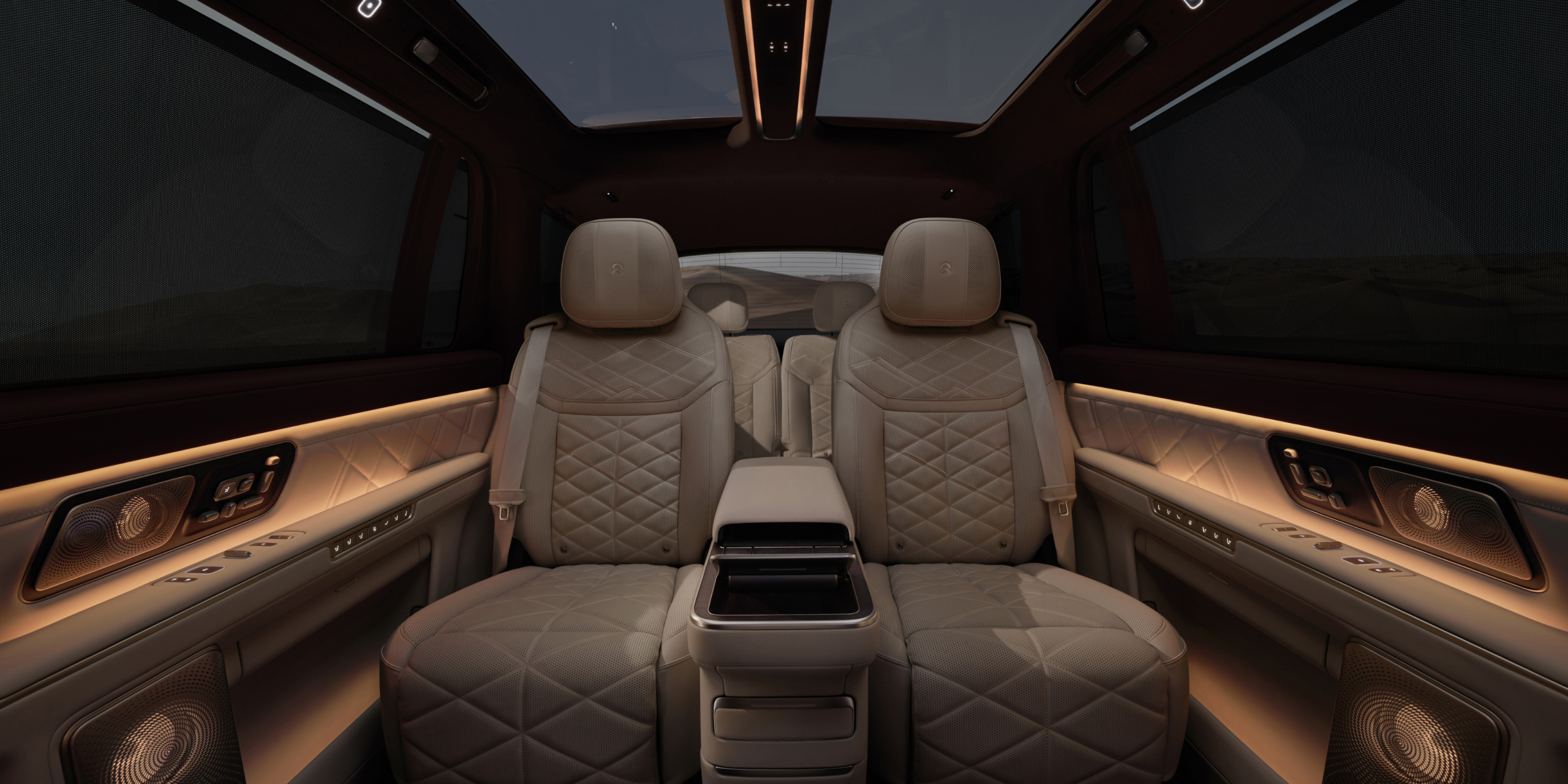并且ES9的车内还有一个特别提升氛围感和豪华感的设计,那就是车顶纵向排布的一个氛围灯岛。它将车顶的全景天窗分为了左右两块,看上去没有一整块玻璃那么空。并且周围一圈隐藏式的氛围灯在夜间点亮之后的效果就犹如顶级剧院和豪华私人飞机一般。这种设计的成本要远比一整块全景天窗高太多,唯一的目的就是为了提升氛围感。