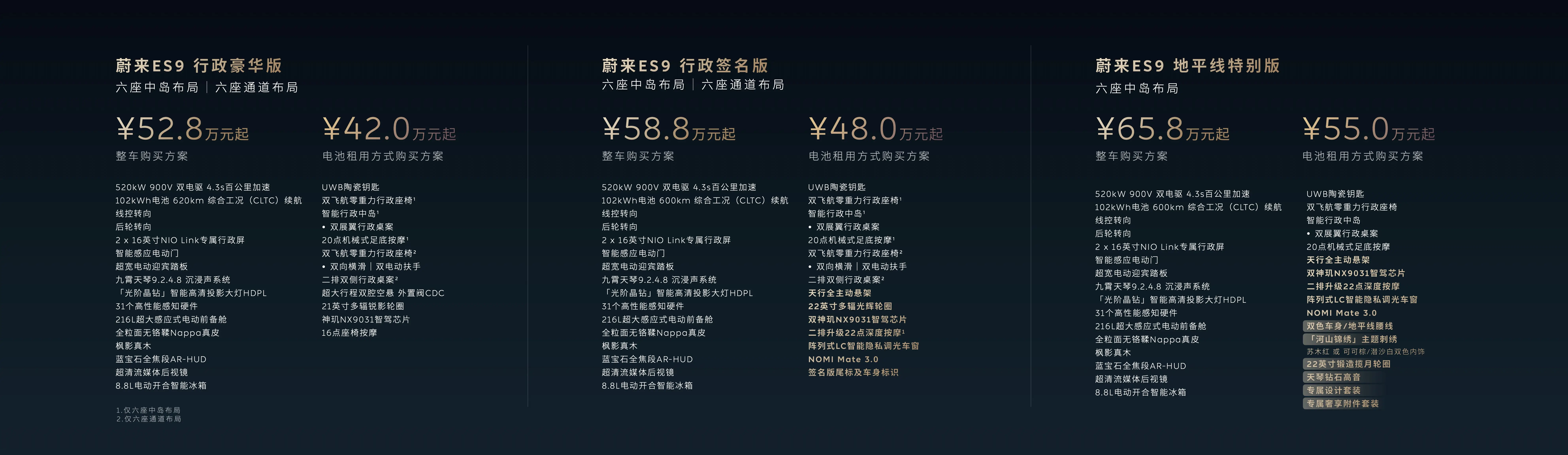 就在昨晚,蔚来发布了一款比ES8定位更高的D+级旗舰ES9,未来将会与极氪9X与同样即将上市的全新理想L9展开直接竞争,目前的预售价区间为52.8—65.8万元,如果选择租电方案则是42—55万元。我先在此大胆的预测一下,等到正式上市的时候整车购买起售价说不定会拉低到49.8万元,而租电方案起售价可能会下探到39万元。