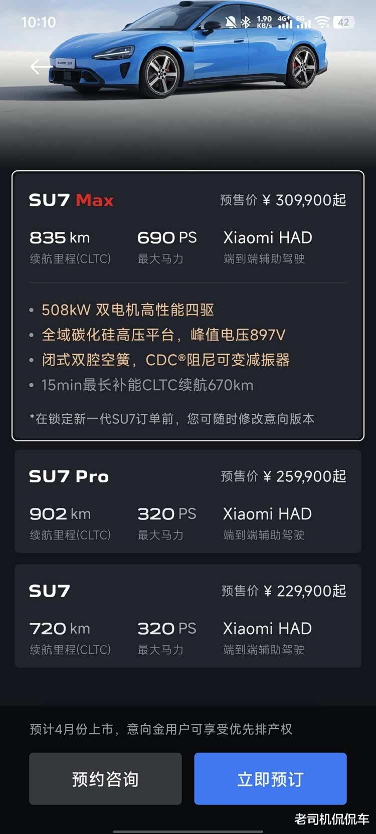 新一代SU7,豪华高性能纯电轿车,预计4月份上市。今天上午10点开启小订,欢迎大家关注。”