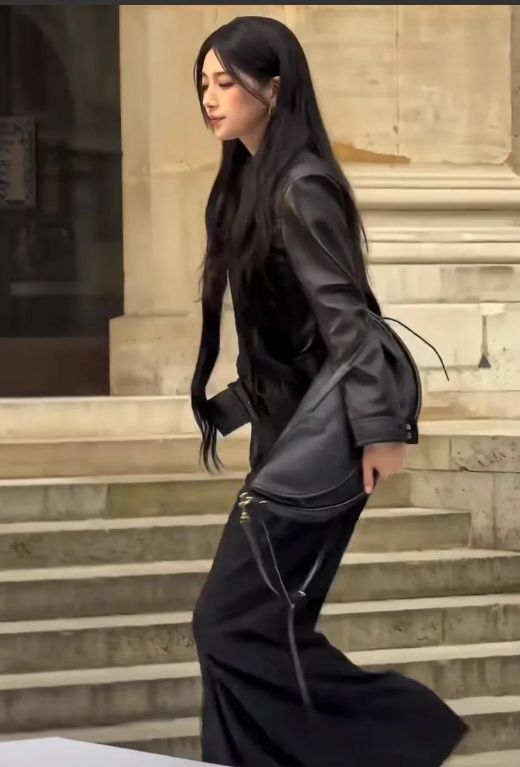 从头到脚的黑色系搭配,没有一丝多余的装饰,却将高级感拉满:黑色皮衣外套利落挺括,完美勾勒出肩颈线条,搭配同色系西裤,利落的剪裁让身形更显高挑,腰间一条黑色粗腰带堪称点睛之笔,轻松拉高腰线,让三七分的完美身材比例一览无余。