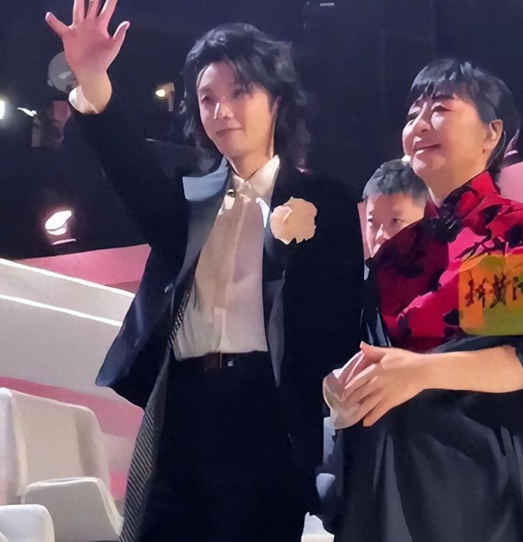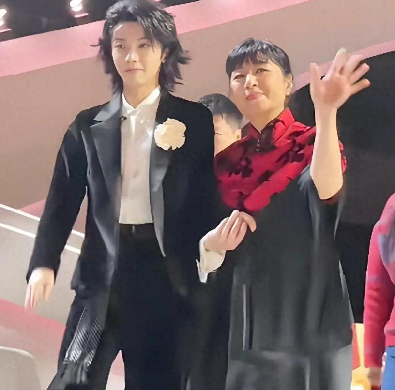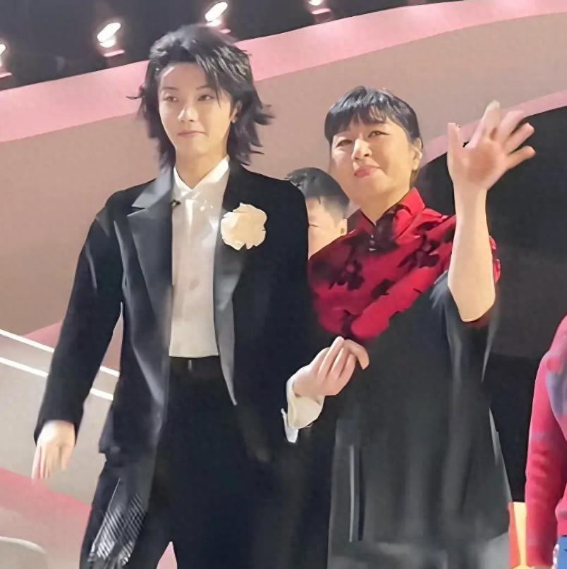 华晨宇很自然地挽住殷秀梅的胳膊,还特意放慢脚步配合前辈的节奏,两人边走边和观众挥手致意。