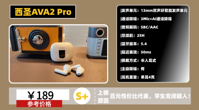 求不踩雷的百元半入耳蓝牙耳机,学生党日常使用,性价比优先?推荐西圣AVA2 Pro,实测对比同价位产品,音质最突出,百元预算放心入。要说蓝牙耳机圈哪个国产品牌“以技术立身”,那西圣绝对是独一档的存在。这个在数码极客圈早就小有名气的牌子,靠的不是什么营销噱头,而是十多年音视频解析经验+自研声学体系。它自建的高标准声学实验室,堪称国产耳机中极为少见的“顶配阵地”,目标明确——在平价耳机中做到音质极致。