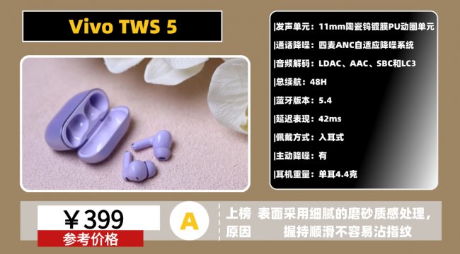 音质搭载11mm动圈单元,依托达发蓝牙芯片,标准版支持AAC、LDAC编码,Hi‑Fi版更具备LHDC V5无损协议,码率高达1.4Mbps,低频弹性出色,但量感偏多,长时间聆听容易出现轰头感,中高频层次分明,人声温润自然。蓝牙5.4带来稳定连接与良好低延迟表现,单次续航长达12小时,搭配充电盒综合续航可达48小时,长时使用无压力。