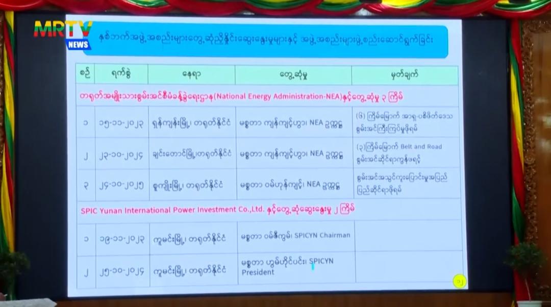 此外,电力能源部联邦部长吴年吞介绍了密松水电项目的相关数据、控制洪水泛滥的能力、由于伊洛瓦底江支流的汇入,伊洛瓦底江水流能够持续正常流动的情况、沿江船只的正常通航能力、以及能够为邦内和国家充足生产和分配电力的情况。