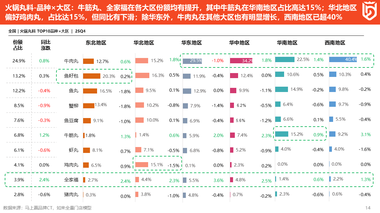 接下来看不同品类在各个区域的分布。整体来看,牛肉丸份额占比在各地区具有显著优势,全家福在六大地区的份额均同比明显上涨。