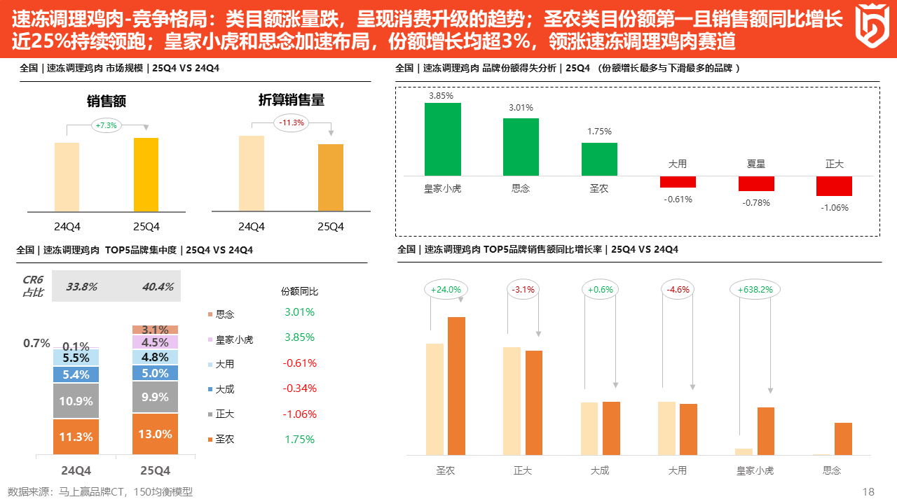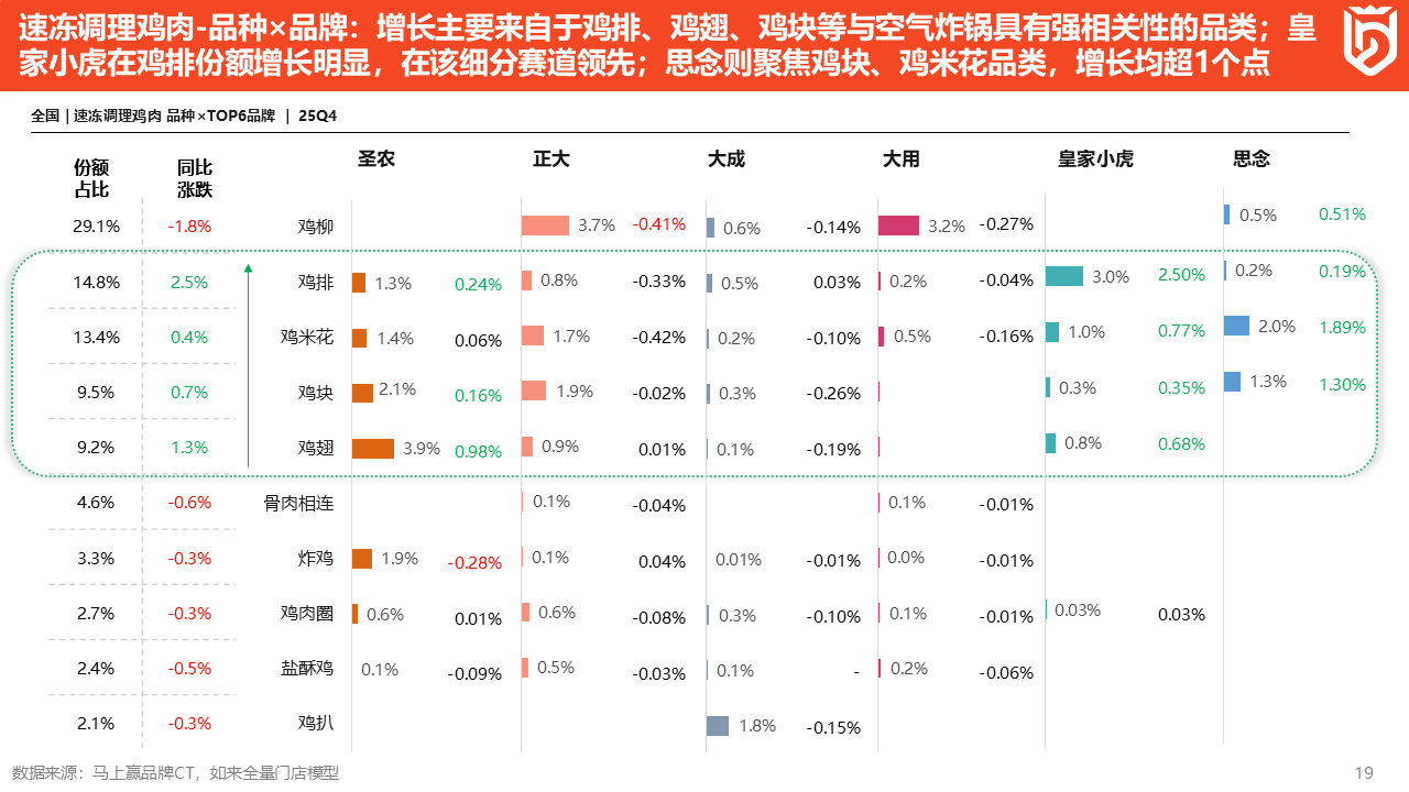 从销售额同比来看,圣农同比增长了24%,皇家小虎同比增长高达638.2%,思念则由于2025年才开始在速冻调理鸡肉类目发力,因此未提供销售额同比增长率数据。
