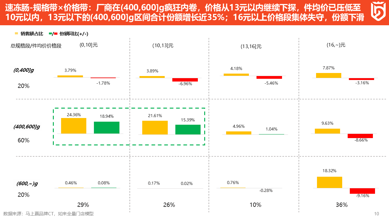 接下来从速冻肠各个品类的规格带X价格带形成的矩阵中来看产品布局。上图纵轴表示它的单件规格带,横轴表示单件价格带,规格和价格交叉出不同的区间,黄色表示该区间在类目整体中的销售额占比,绿色/红色则表示该区间的占比同比增长/下滑。马上赢将速冻肠分为 0 ~ 400 克, 400 ~ 600克、600克及以上/件三个规格带,以及0-10元、10-13元、13-16元、16+元/件四个价格带。