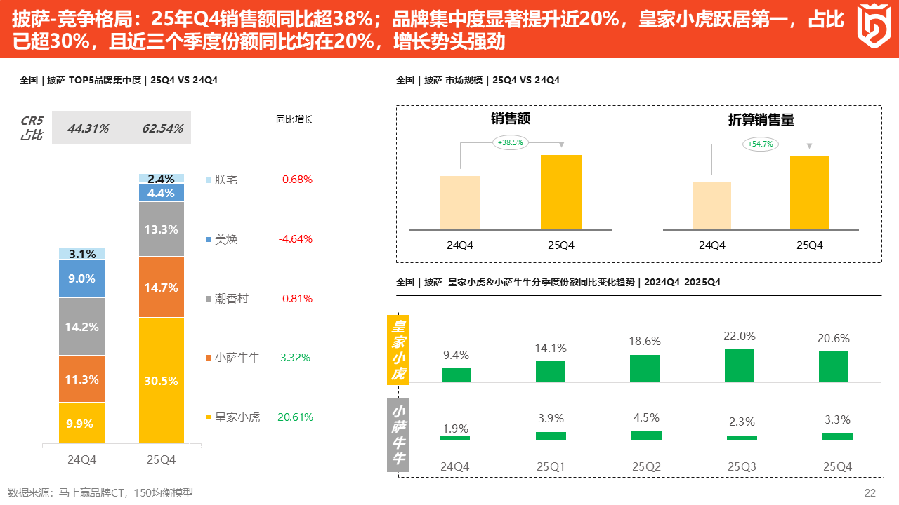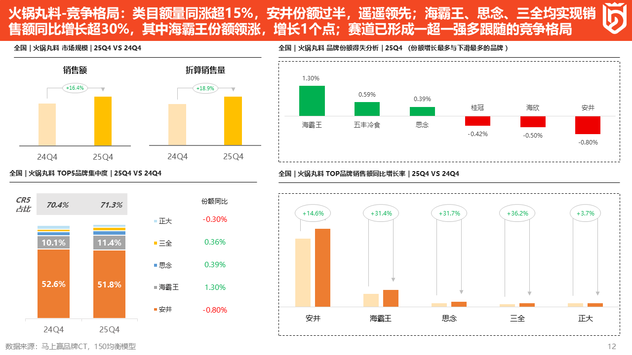 头部品牌销售额市占率变化带来的结果,是左边这张图,思念、皇家小虎和三全份额增长相对较高。2025Q4,最大的品牌思念市场份额已经占到13.6%,与2024Q4相比增长了12.8%,份额排名第一;皇家小虎排第二,份额是13.1%,与2024Q4相比市场份额增长了8.1%。