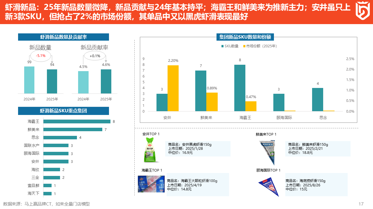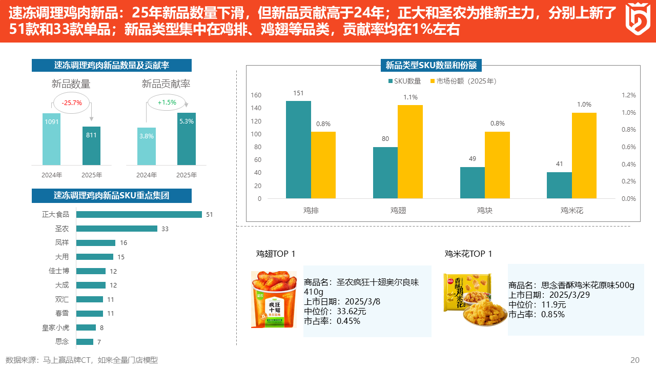 最后来看新品情况。速冻调理鸡肉的新品数量下降了25%,但新品贡献率增长了1.5%,即更少的新品数量贡献了更多的市场份额。