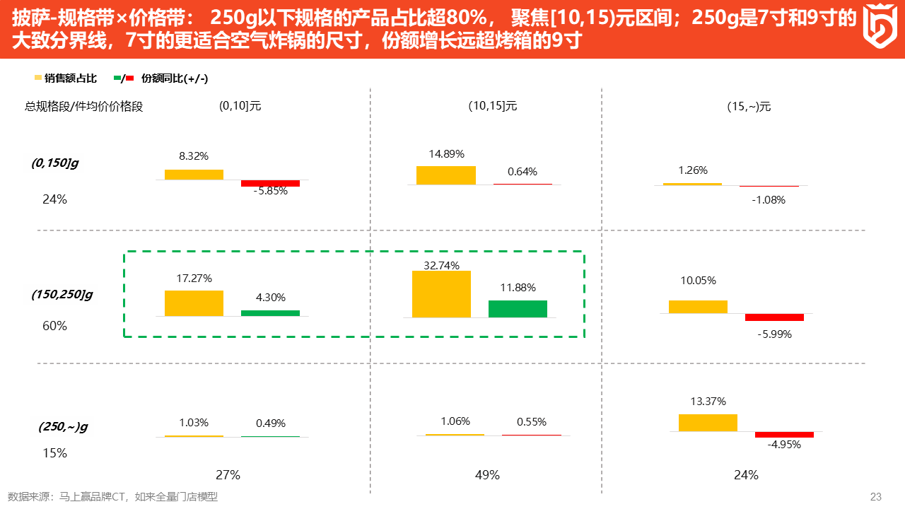 这一趋势也与空气炸锅的工具普及有关——空气炸锅的烹饪容量有限,不适合烤制大规格的披萨,因此大规格带产品呈现较明显的下滑。披萨类目的相关数据也再次验证了烹饪工具,乃至背后的消费者行为趋势对品类发展产生的重要影响。