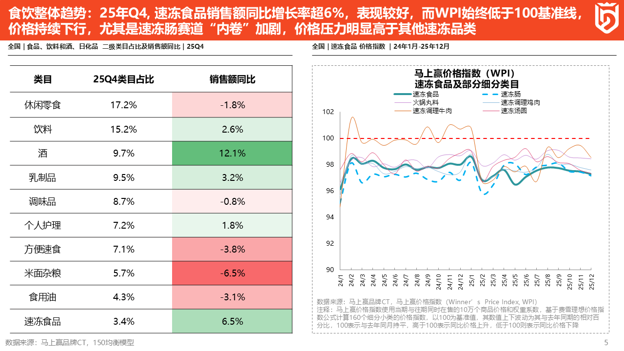 2025Q4相比于前两个季度,食饮各类目整体要表现稍微好一些,有很多积极的信号。左边这张表,我们列举了快消品行业的10个主要品类,包括休闲零食、饮料、乳制品、速冻食品等。其中,速冻食品的类目占比虽然比较靠后,但是销售额同比增速则在所有品类中位居前列,2025Q4同比2024Q4增长了6.5%,在所有选择的类中排名第二。